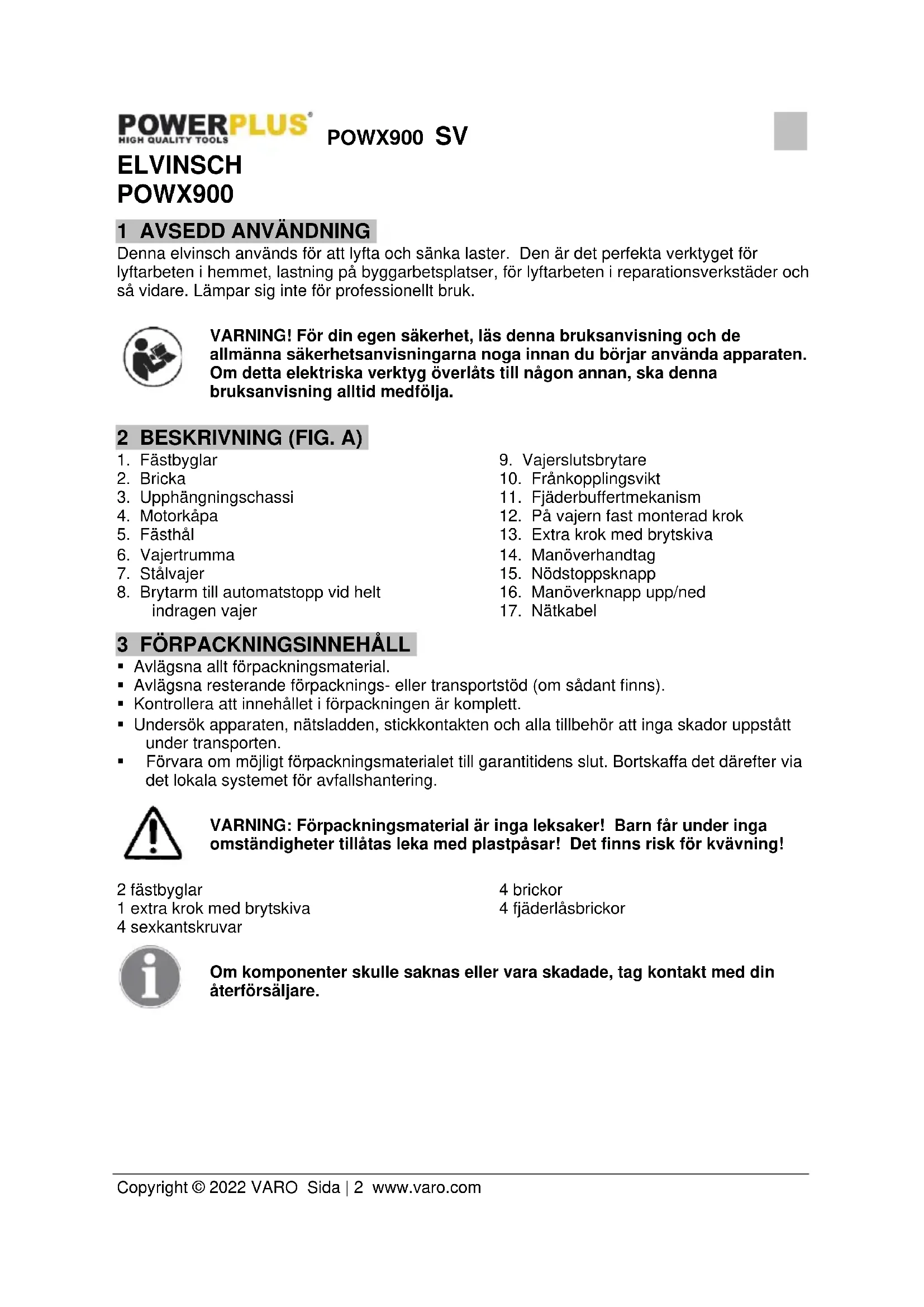- När apparaten tjänat ut, returnera den till återförsäljaren för att säkerställa en professionell återvinning.POWX900 SV Copyright © 2022 VARO Sida | 9 www.varo.com 11 TEKNISKA DATA Märkspänning 230 V~ Märkfrekvens 50 Hz Märkeffekt 500 W Märkström 2,18 A Max. lyftkapacitet - enkel vajer - dubbel vajer