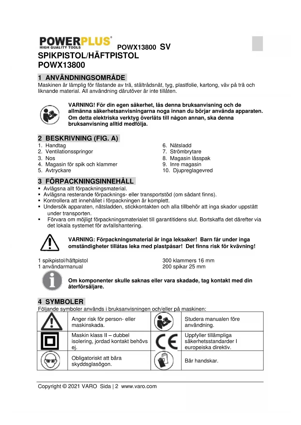 - Använd inte häftpistolen för att fästa elektriska kablar. Den är inte konstruerad för installation av elektrisk kabel och kan skada isoleringen på elektriska kablar och därigenom orsaka elektriska stötar eller brandrisk.POWX13800 SV Copyright © 2021 VARO Sida | 5 www.varo.com 7 MONTERING OCH Varning: Häftpistolen lämpar sig INTE för spikning eller klamring i betong, murverk, tegel eller metall. Varning: Tryck inte på avtryckaren om spik eller klammer fastnat i häftpistolens nosparti (3). Varning! Dra alltid häftpistolens stickkontakt ur eluttaget när maganiset ska fyllas på.