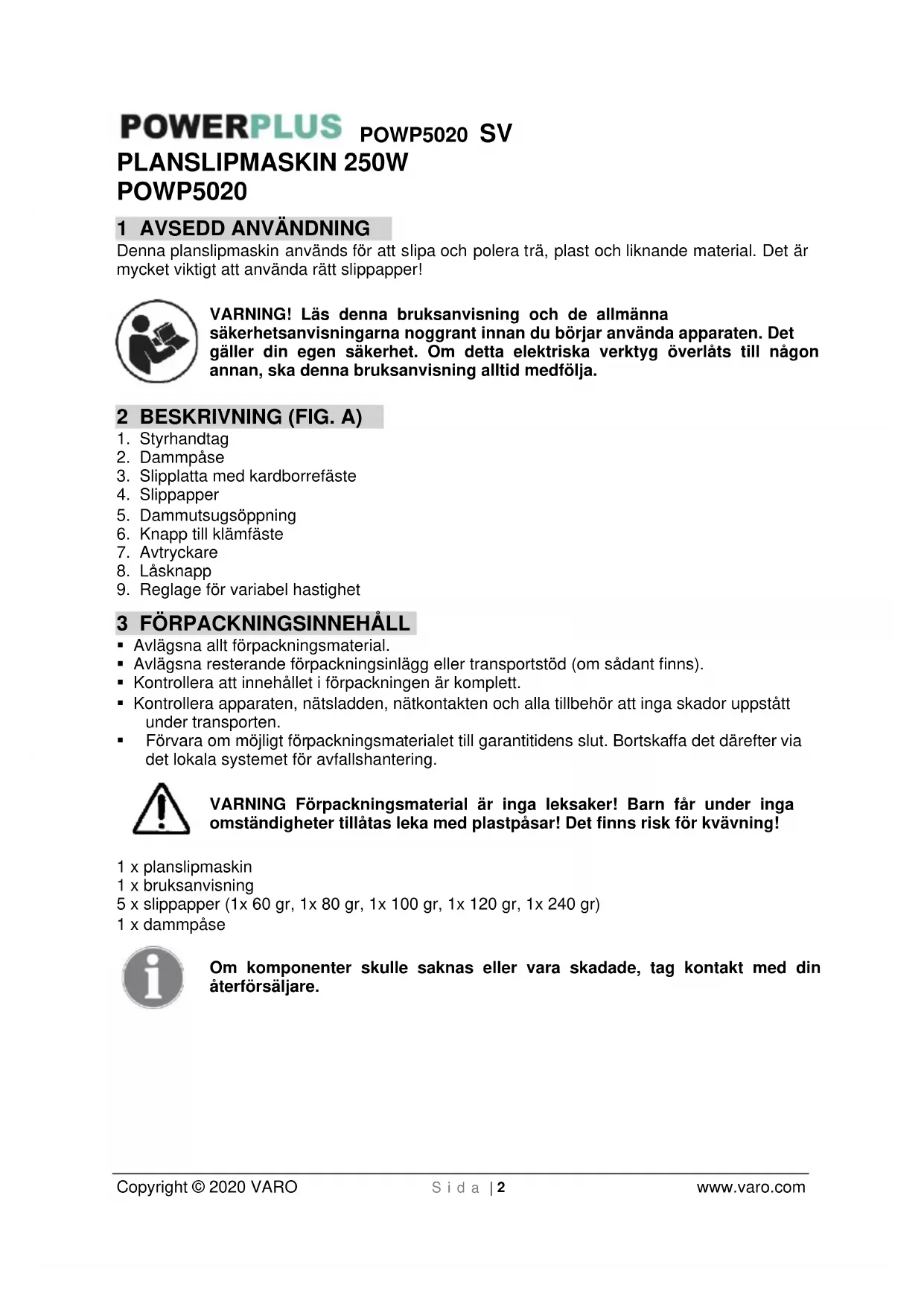 - Vi förbehåller oss rätten att avvisa alla garantiansökningar där inköpet inte kan bestyrkas eller om det står klart att produkten inte underhållits på rätt sätt (rena ventilationsspringor, kolborstarna regelbundet servade…)POWP5020 SV Copyright © 2020 VARO S i d a | 8 www.varo.com
