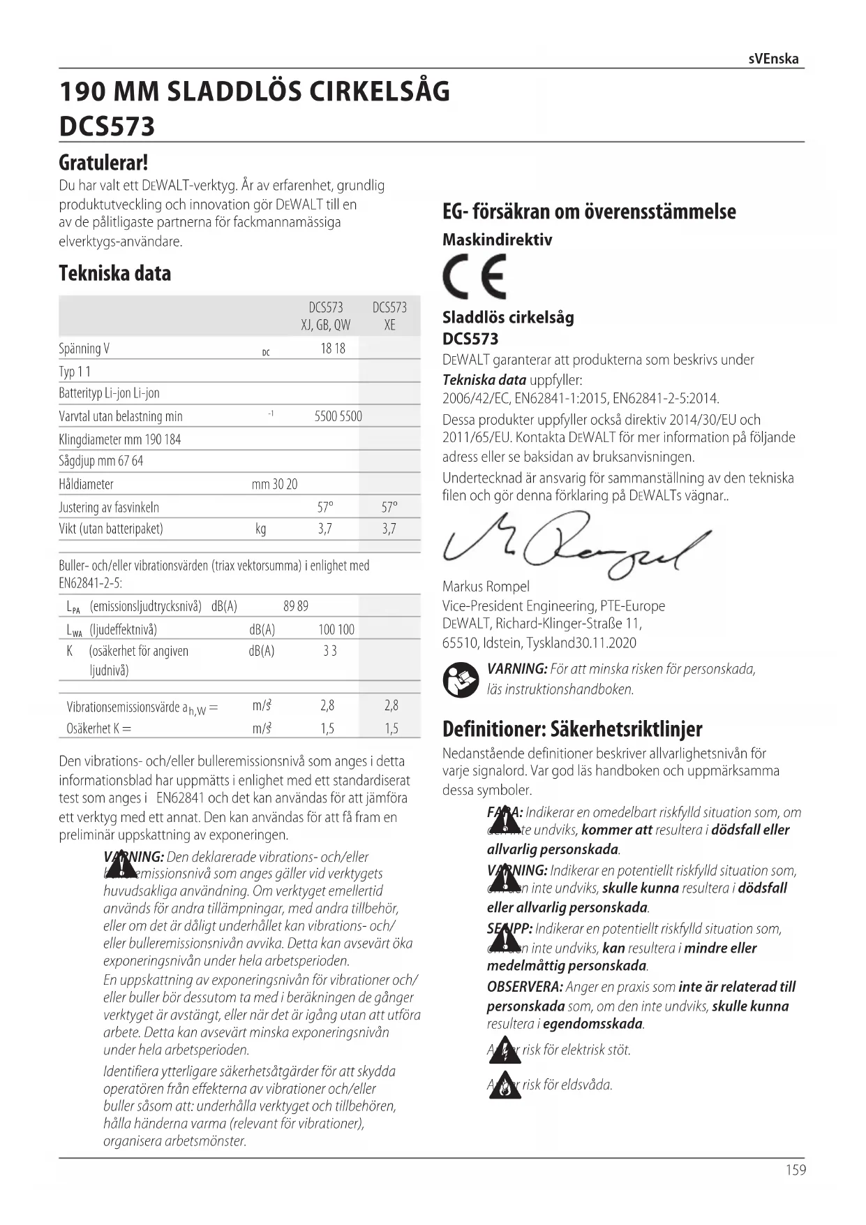 VAROITUS: Muita kuin DeWALT-lisävarusteita ei ole testattu tämän työkalun kanssa, joten niiden käyttäminen voi olla vaarallista. Käytä tämän laitteen kanssa vain DeWALTin suosittelemia varusteita vahingoittumisvaaranvähentämiseksi. Saat lisätietojajälleenmyyjältäsi. Terät Tylsä terä aiheuttaa tehottoman leikkauksen, ylikuormittaa sahan moottorin, liiallisesti siruja, ja lisää takaiskun mahdollisuutta. Vaihda terät, kun sahan painaminen leikkauksen läpi on vaikeampaa, kun moottori kuormittuu tai kun terään muodostuu liikaa lämpöä. Pidä varateriä aina saatavilla, jotta terävät terät ovat välittömästi käytettävissä. Tylsät terät voidaan teroittaa useimmillaalueilla. Kovettunut pihka voidaan poistaa terästä kerosiinilla, tärpätillä tai uunin puhdistusaineella. Tarttumattomalla pinnalla päällystettyjä teriä voidaan käyttää, kun liiallista kertymistä esiintyy, esimerkiksi painekäsiteltyä ja vihreää puutavaraaleikatessa.159 sVEnska VARNING: För att minska risken för personskada, läsinstruktionshandboken. Definitioner: Säkerhetsriktlinjer Nedanstående definitioner beskriver allvarlighetsnivån för varje signalord. Var god läs handboken och uppmärksamma dessasymboler. FARA: Indikerar en omedelbart riskfylld situation som, om den inte undviks, kommer att resultera i dödsfall eller allvarligpersonskada. VARNING: Indikerar en potentiellt riskfylld situation som, om den inte undviks, skulle kunna resultera i dödsfall eller allvarligpersonskada. SE UPP: Indikerar en potentiellt riskfylld situation som, om den inte undviks, kan resultera i mindre eller medelmåttigpersonskada. OBSERVERA: Anger en praxis som inte är relaterad till personskada som, om den inte undviks, skulle kunna resultera iegendomsskada. Anger risk för elektriskstöt. Anger risk föreldsvåda. EG‑ försäkran om överensstämmelse Maskindirektiv Sladdlös cirkelsåg DCS573 DeWALT garanterar att produkterna som beskrivs under Tekniska data uppfyller: 2006/42/EC, EN62841‑1:2015, EN62841‑2‑5:2014.Dessa produkter uppfyller också direktiv 2014/30/EU och 2011/65/EU. Kontakta DeWALT för mer information på följande adress eller se baksidan avbruksanvisningen.Undertecknad är ansvarig för sammanställning av den tekniska filen och gör denna förklaring på DeWALTs vägnar..Markus Rompel Vice‑President Engineering, PTE‑Europe DeWALT, Richard‑Klinger‑Straße 11, 65510, Idstein, Tyskland30.11.2020Den vibrations‑ och/eller bulleremissionsnivå som anges i detta informationsblad har uppmätts i enlighet med ett standardiserat test som anges i EN62841 och det kan användas för att jämföra ett verktyg med ett annat. Den kan användas för att få fram en preliminär uppskattning avexponeringen. VARNING: Den deklarerade vibrations- och/eller bulleremissionsnivå som anges gäller vid verktygets huvudsakliga användning. Om verktyget emellertid används för andra tillämpningar, med andra tillbehör, eller om det är dåligt underhållet kan vibrations- och/eller bulleremissionsnivån avvika. Detta kan avsevärt öka exponeringsnivån under helaarbetsperioden.En uppskattning av exponeringsnivån för vibrationer och/eller buller bör dessutom ta med i beräkningen de gånger verktyget är avstängt, eller när det är igång utan att utföra arbete. Detta kan avsevärt minska exponeringsnivån under helaarbetsperioden.Identifiera ytterligare säkerhetsåtgärder för att skydda operatören från effekterna av vibrationer och/eller buller såsom att: underhålla verktyget och tillbehören, hålla händerna varma (relevant för vibrationer), organiseraarbetsmönster.DCS573 XJ, GB, QWDCS573 Spänning V 18 18Typ 1 1Batterityp Li‑jon Li‑jonVarvtal utan belastning min 5500 5500Klingdiameter mm 190 184Sågdjup mm 67 64Håldiameter mm 30 20Justering av fasvinkeln 57° 57° Vikt (utan batteripaket) kg 3,7 3,7 Buller‑ och/eller vibrationsvärden (triax vektorsumma) i enlighet med EN62841‑2‑5: