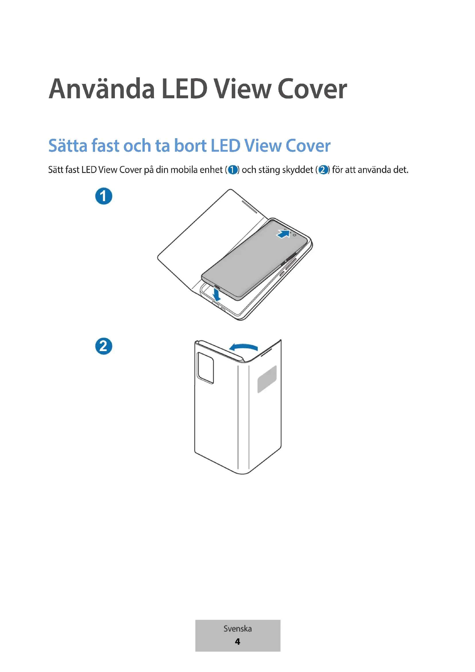 Använda LED View Cover Sätta fast och ta bort LED View Cover Sätt fast LED View Cover på din mobila enhet ( 1 ) och stäng skyddet ( 2 ) för att använda det.