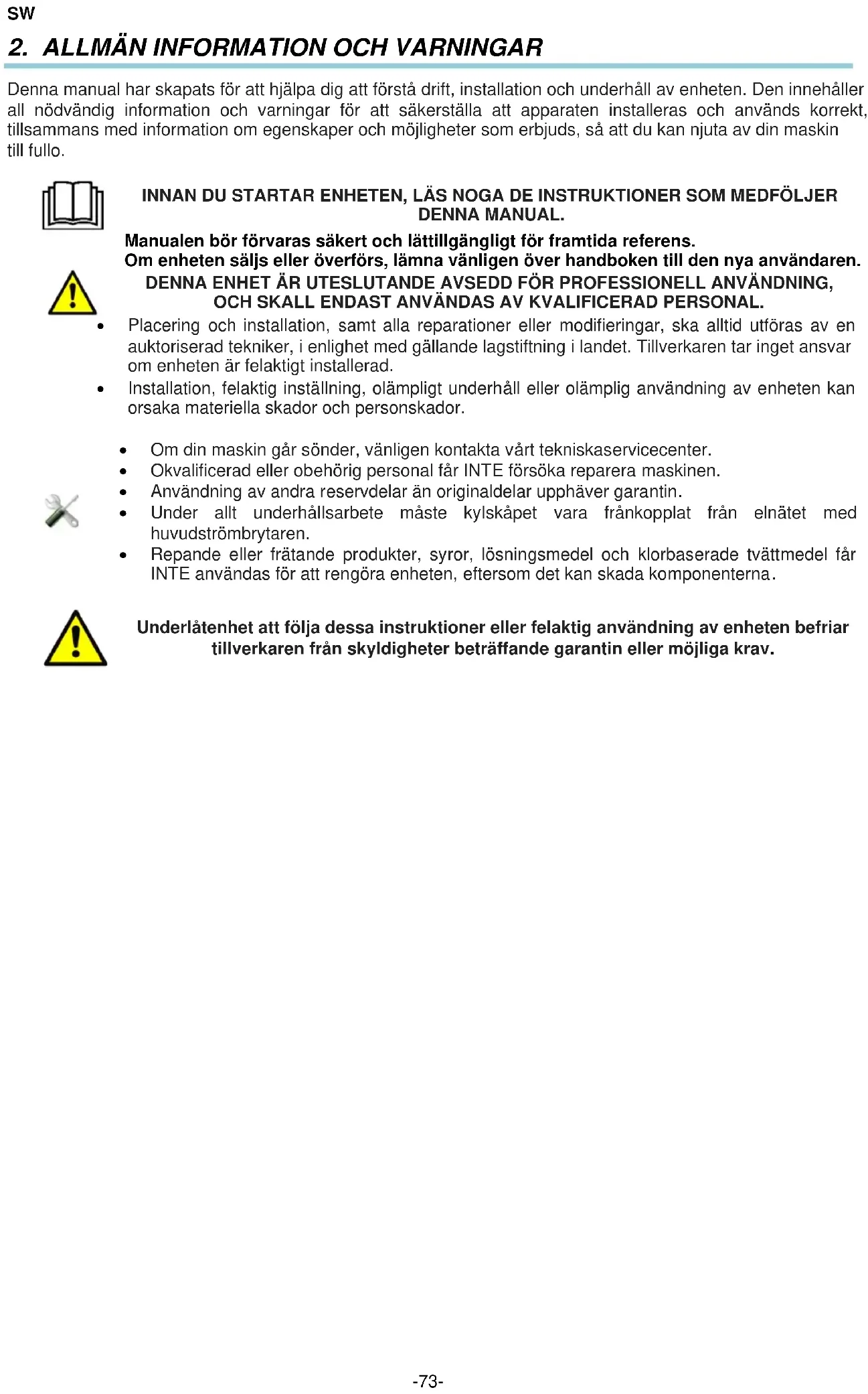 Underlåtenhet att följa dessa instruktioner eller felaktig användning av enheten befriar tillverkaren från skyldigheter beträffande garantin eller möjliga krav.SW