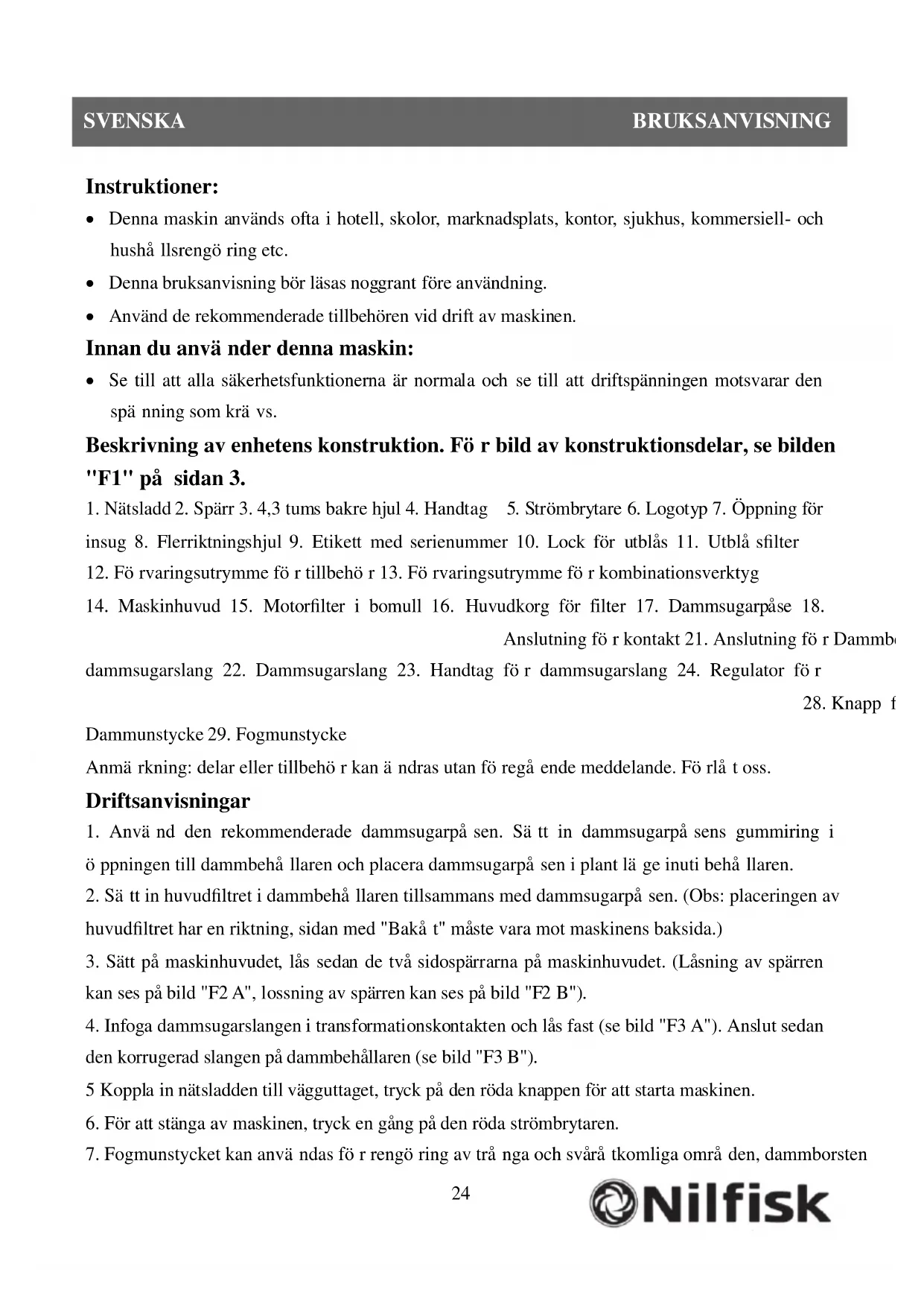Instruktioner: Denna maskin används ofta i hotell, skolor, marknadsplats, kontor, sjukhus, kommersiell- och hushållsrengöring etc. Denna bruksanvisning bör läsas noggrant före användning. Använd de rekommenderade tillbehören vid drift av maskinen. Innan du använder denna maskin: Se till att alla säkerhetsfunktionerna är normala och se till att driftspänningen motsvarar den spänning som krävs. Beskrivning av enhetens konstruktion. För bild av konstruktionsdelar, se bilden "F1" på sidan 3.