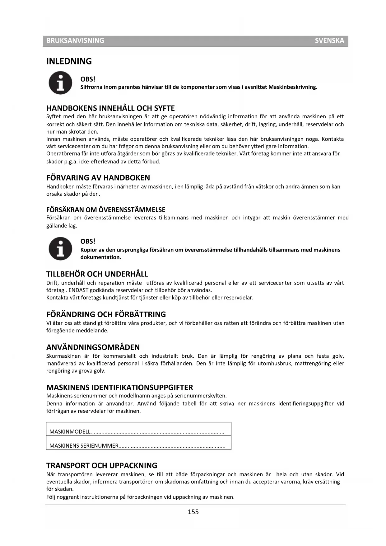 Skurmaskinen är för kommersiellt och industriellt bruk. Den är lämplig för rengöring av plana och fasta golv, manövrerad av kvalificerad personal i säkra förhållanden. Den är inte lämplig för utomhusbruk, mattrengöring eller rengöring av grova golv. MASKINENS IDENTIFIKATIONSUPPGIFTER Maskinens serienummer och modellnamn anges på serienummerskylten. Denna information är användbar. Använd följande tabell för att skriva ner maskinens identifieringsuppgifter vid förfrågan av reservdelar för maskinen. MASKINMODELL....................................................................................... MASKINENS SERIENUMMER......................................................................