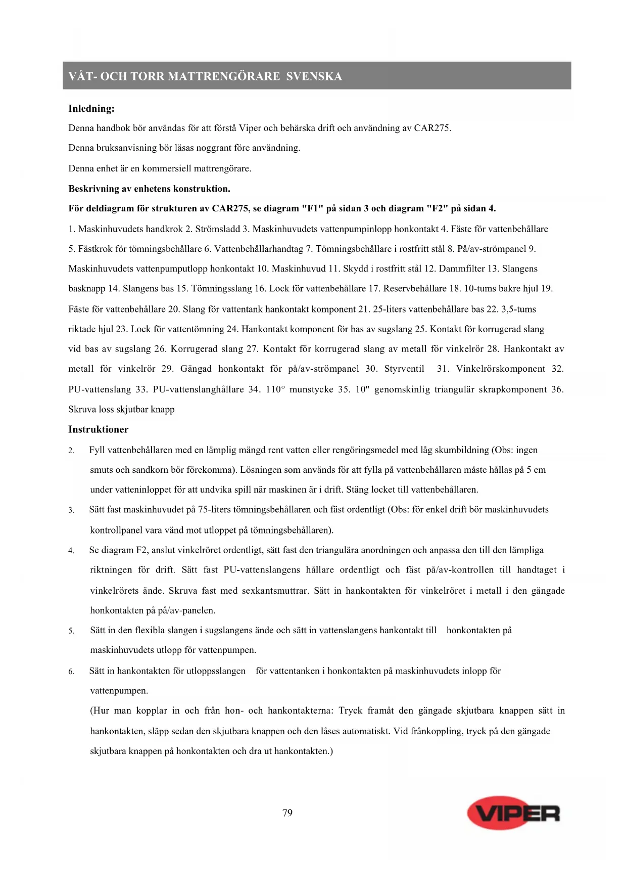 Inledning: Denna handbok bör användas för att förstå Viper och behärska drift och användning av CAR275. Denna bruksanvisning bör läsas noggrant före användning. Denna enhet är en kommersiell mattrengörare. Beskrivning av enhetens konstruktion. För deldiagram för strukturen av CAR275, se diagram "F1" på sidan 3 och diagram "F2" på sidan 4.