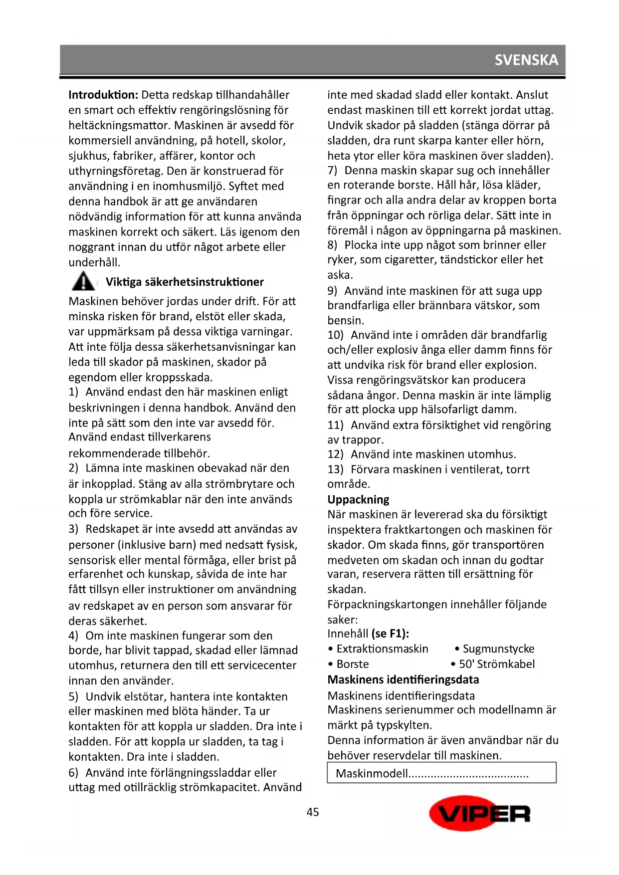 Maskinnummer ................................... Maskinkomponenter (se sida 2) 1.aktiveringsbrytare 2.krok för elsladden 3.elsladd 4.handtag (rostfritt) 5.renvattentank 6.bakhjul 7.maskinbas 8.fotstöd parkeringspedal 9.justering av borstryck 10.ta av sugmunstycket 11.inlopp 12.kupol 13.påfyllning av vatten 14.viper logotyp 15.sugmunstycke 16.kontrollpanel 17.handverktyg (tillval) 18.handverktyg spraymunstycke 19.snabbkoppling för handverktyg 20.förvaring av möbelmunstycke (tillval) 21.slang för möbelmunstycke 22.kabelklämma 23.baspanel 24.handtagslås 25.slangklämma 26.tömning av vattentanken med koppling 27. indikator för vattennivå 28.sugslang 29.tömningsslang för smutstanken 30.snabbkoppling för tillbehör 31.vattenfilter 32.axel 33.fotstöd 34.munstycksbasen 35.sprutmunstycken 36.slitplatta 37.fotstöd mutter 38.maskin monteringsbult 39.borste 40.hållare för borste 41.smutstankens kupol hake 42 smutstank 43.flottör 44.flottörkåpa 45.skumfilter 46.skumfilter hållare 47.kilremskåpa Installation av sugmunstycket och borsten Installation av sugmunstycket (se F2):