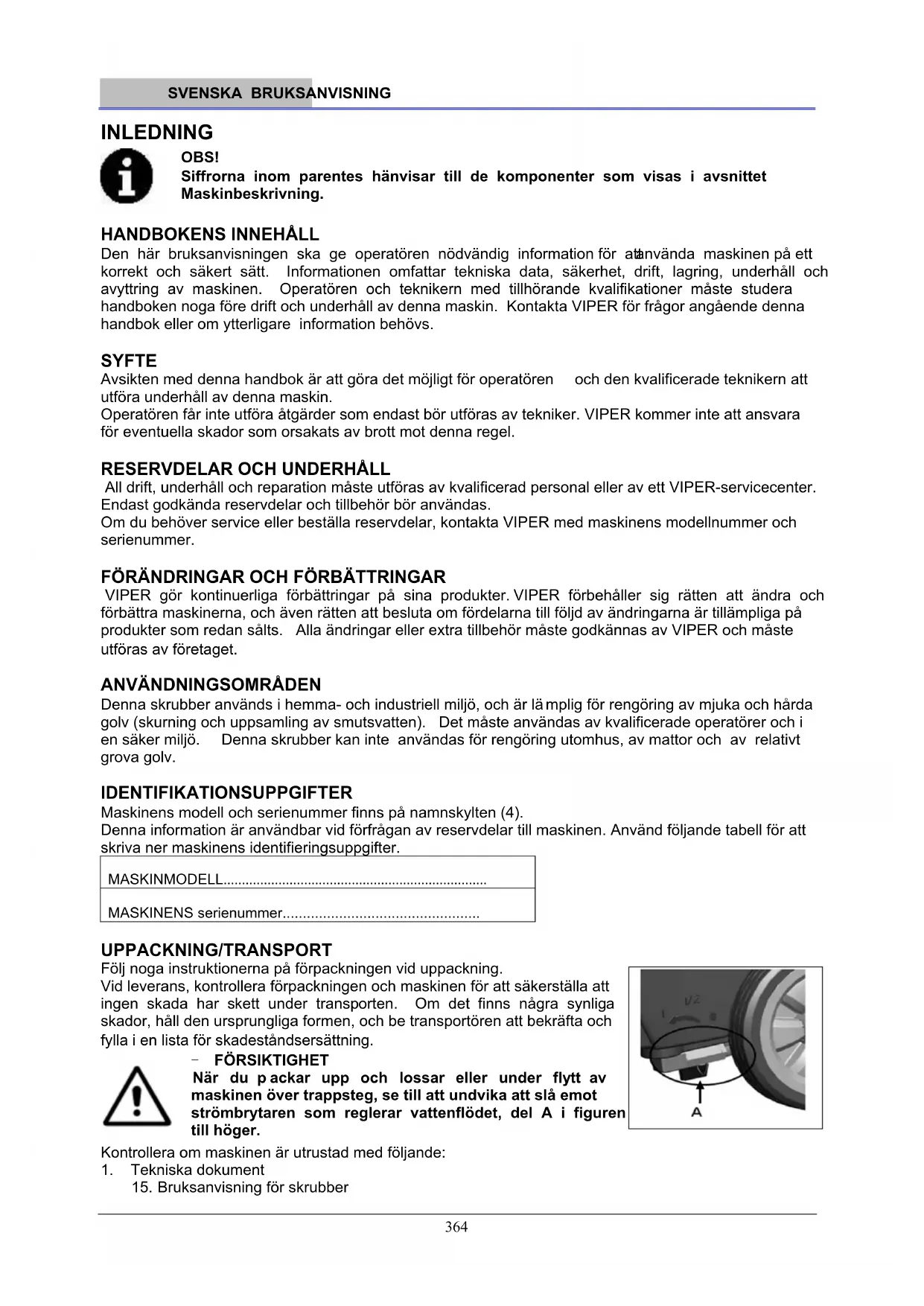 Denna skrubber används i hemma- och industriell miljö, och är lä mplig för rengöring av mjuka och hårda golv (skurning och uppsamling av smutsvatten). Det måste användas av kvalificerade operatörer och i en säker miljö. Denna skrubber kan inte användas för rengöring utomhus, av mattor och av relativt grova golv. IDENTIFIKATIONSUPPGIFTER Maskinens modell och serienummer finns på namnskylten (4). Denna in formation är användbar vid förfrågan av reservdelar till maskinen. Använd följande tabell för att skriva ner maskinens identifieringsuppgifter. MASKINMODELL........................................................................ MASKINENS serienummer................................................. UPPACKNING/TRANSPORT Följ noga instruktionerna på förpackningen vid uppackning. Vid leverans, kontrollera förpackningen och maskinen för att säkerställa att ingen skada har skett under transporten. Om det finns några synliga skador, håll den ursprungliga formen, och be transportören att bekräfta och fylla i en lista för skadeståndsersättning. ‒ FÖRSIKTIGHET När du p ackar upp och lossar eller under fly tt av maskinen över trappsteg, se till att undvika att slå emot strömbrytaren som reglerar vattenflödet, del A i figuren till höger. Kontrollera om maskinen är utrustad med följande: