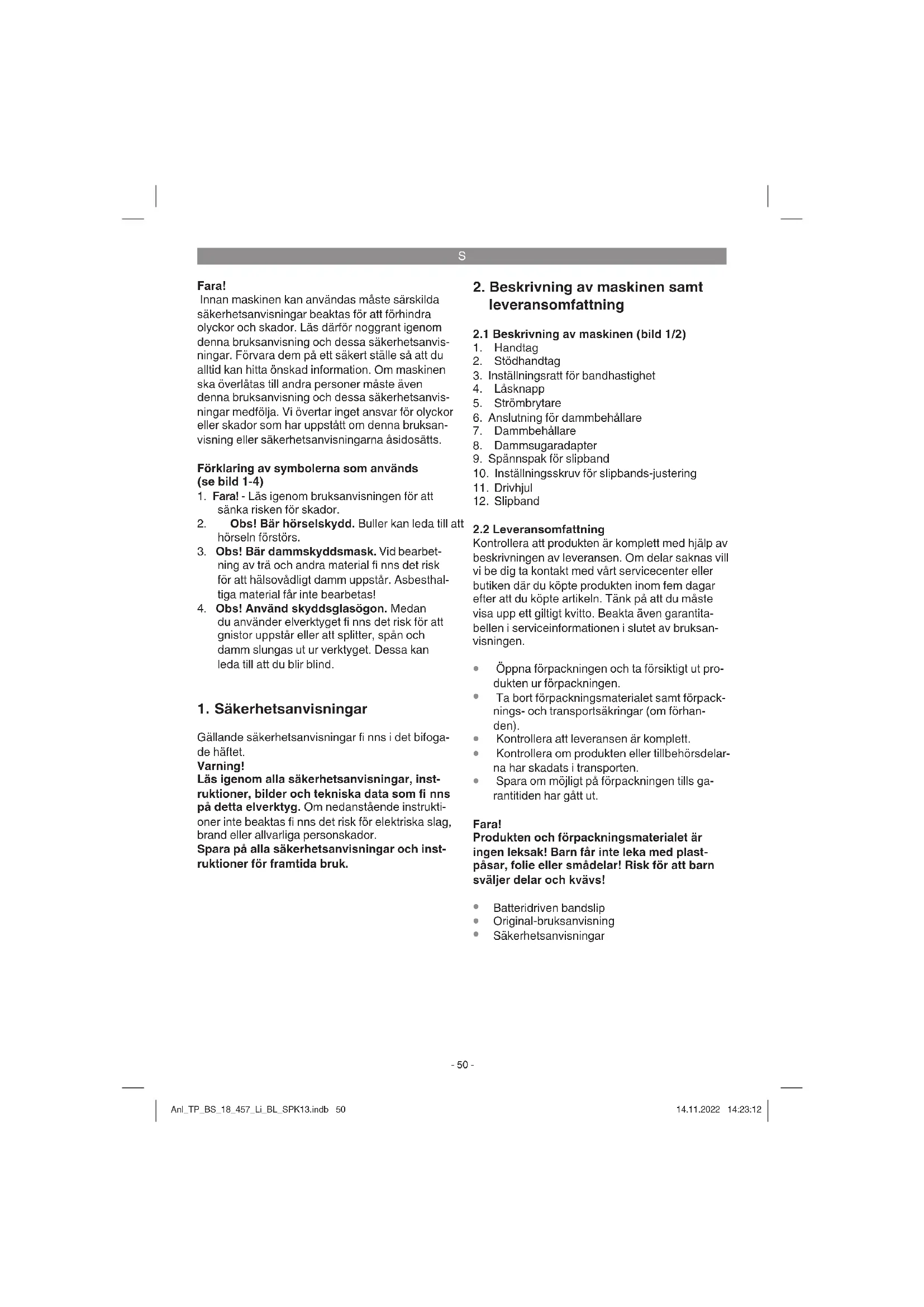armvibrationer om maskinen används under längre tid eller om det inte hanteras och un- derhålls enligt föreskrift. Anl_TP_BS_18_457_Li_BL_SPK13.indb 51Anl_TP_BS_18_457_Li_BL_SPK13.indb 51 14.11.2022 14:23:1314.11.2022 14:23:13S