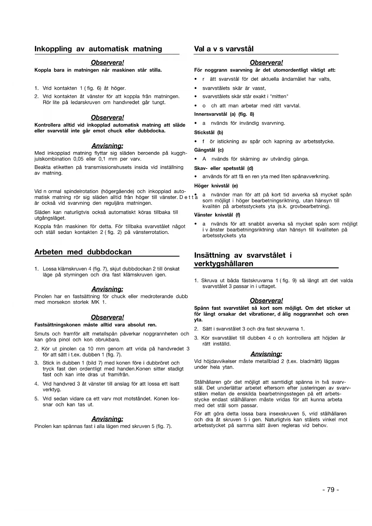 snar och kan tas ut. Anvisning: Pinolen kan spännas fast ialla lägen med skruven 5(fig. 7). Valavsvarvstål Observera! För noggrann svarvning är det utomordentligt viktigt att:
