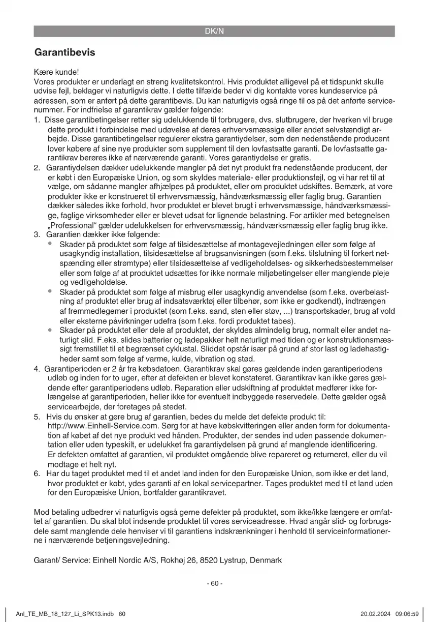 tillhandahålls våra garantitjänster av en lokal servicepartner. Om produkten har fl yttats till ett land utanför Europeiska unionen täcks den inte längre av garantin. Givetvis kan vi även, mot debitering, åtgärda skador som antingen inte täcks av garantin eller som har uppstått efter garantitidens slut. Skicka in produkten till nedanstående serviceadress. För slitage- och förbrukningsdelar samt för delar som saknas hänvisar vi till begränsningarna i garantin enligt serviceinformationen som anges i denna bruksanvisning. Garant/ Service: Einhell Nordic A/S, Rokhøj 26, 8520 Lystrup, Denmark Anl_TE_MB_18_127_Li_SPK13.indb 70Anl_TE_MB_18_127_Li_SPK13.indb 70 20.02.2024 09:07:0220.02.2024 09:07:02CZ