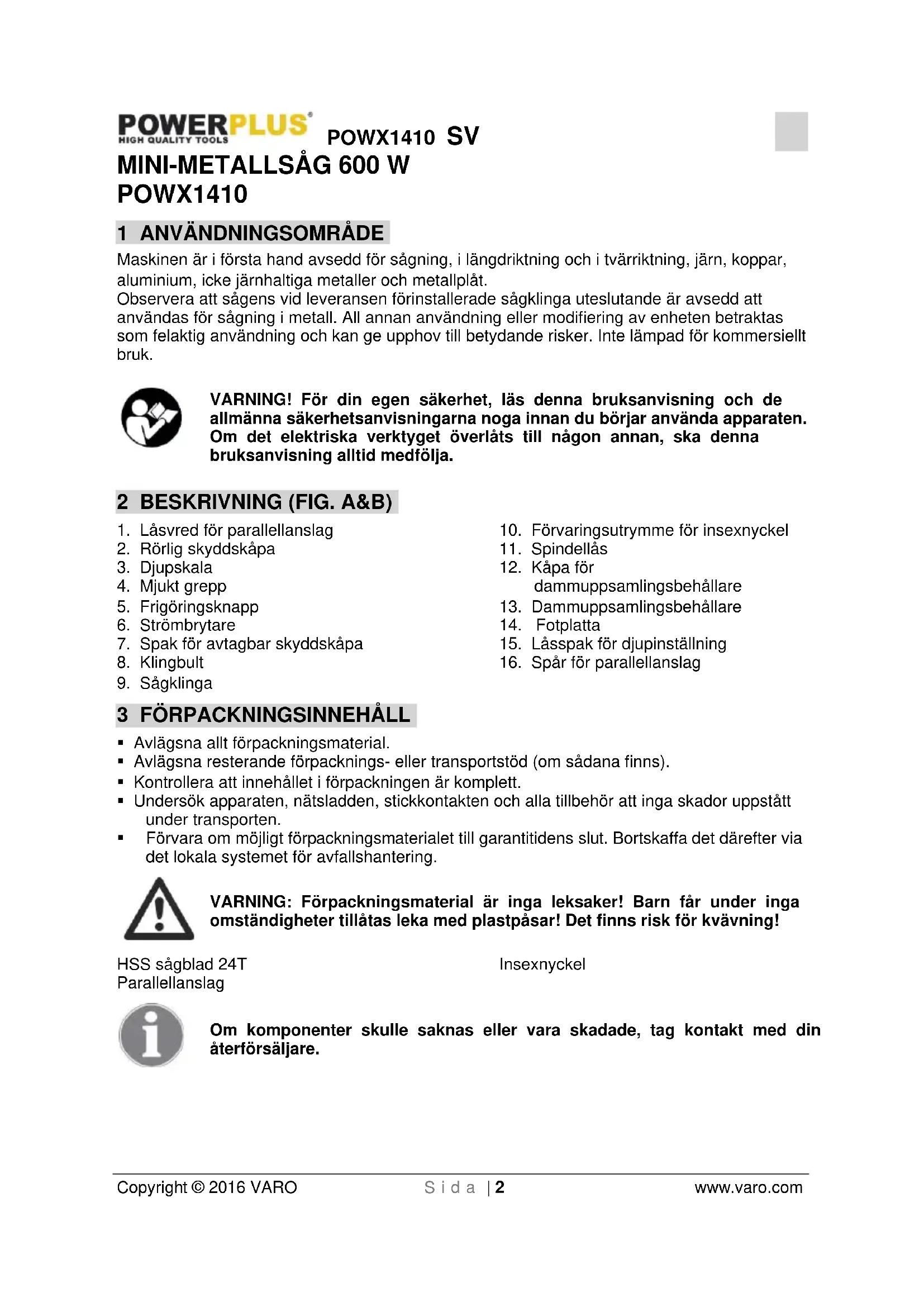 Avlägsna allt förpackningsmaterial. Avlägsna resterande förpacknings- eller transportstöd (om sådana finns). Kontrollera att innehållet i förpackningen är komplett. Undersök apparaten, nätsladden, stickkontakten och alla tillbehör att inga skador uppstått under transporten. Förvara om möjligt förpackningsmaterialet till garantitidens slut. Bortskaffa det därefter via det lokala systemet för avfallshantering. VARNING: Förpackningsmaterial är inga leksaker! Barn får under inga omständigheter tillåtas leka med plastpåsar! Det finns risk för kvävning! HSS sågblad 24T Parallellanslag Insexnyckel Om komponenter skulle saknas eller vara skadade, tag kontakt med din återförsäljare.POWX1410 SV Copyright © 2016 VARO S i d a | 3 www.varo.com 4 SYMBOLER Följande symboler används i bruksanvisningen och/eller på maskinen: