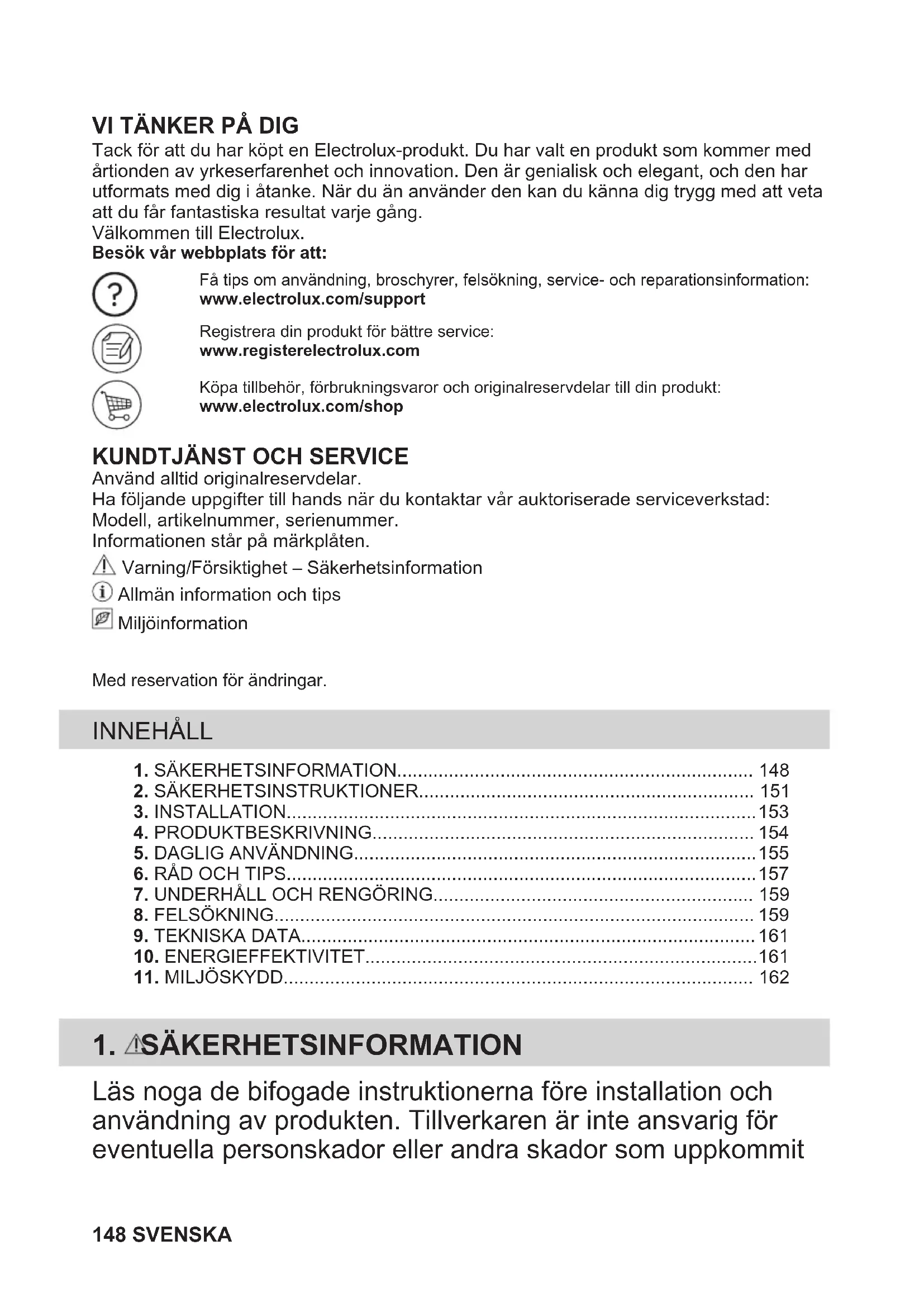 Använd alltid originalreservdelar.Ha följande uppgifter till hands när du kontaktar vår auktoriserade serviceverkstad:Modell, artikelnummer, serienummer.Informationen står på märkplåten. Varning/Försiktighet – Säkerhetsinformation Allmän information och tips MiljöinformationMed reservation för ändringar. INNEHÅLL