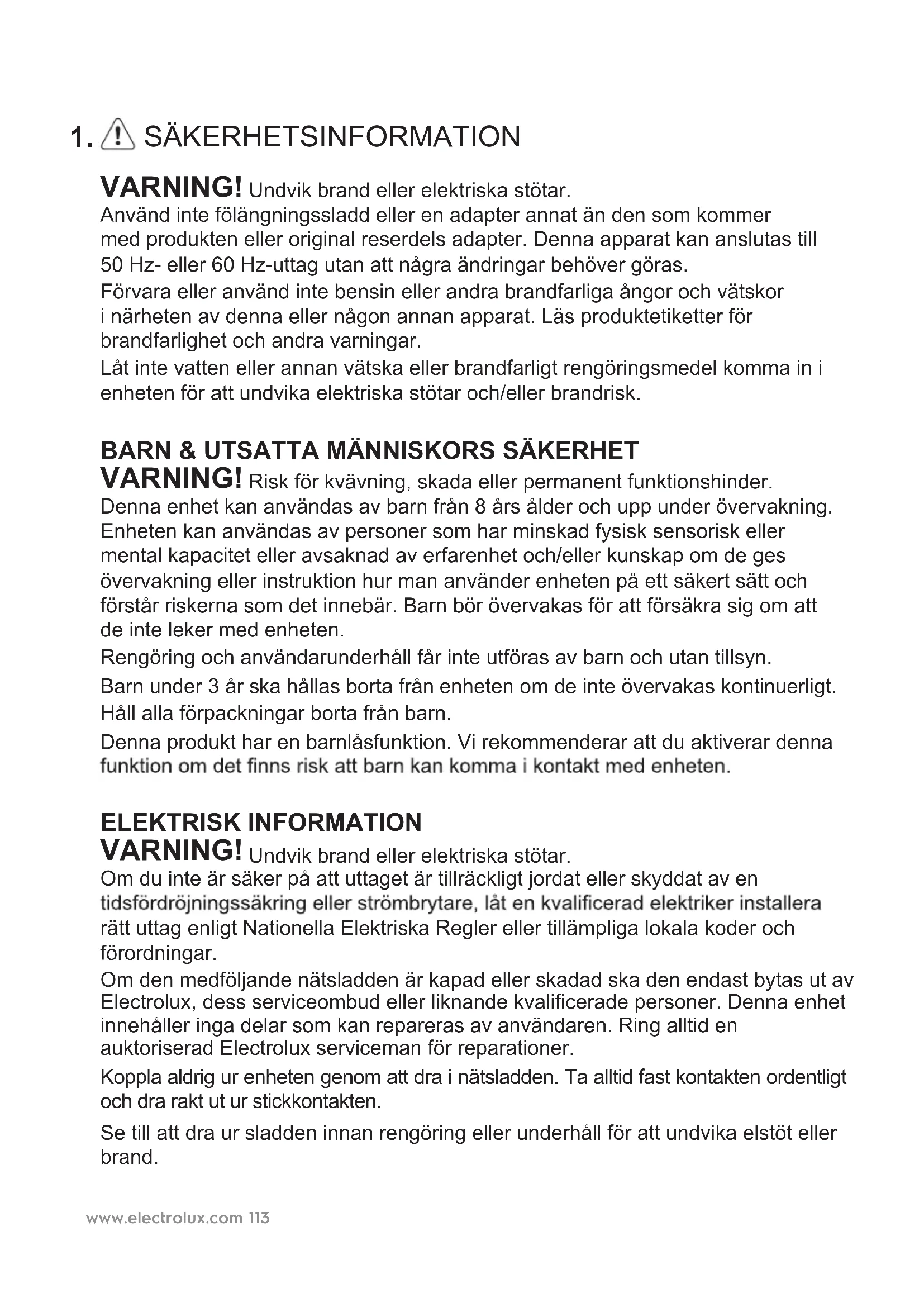 VARNING! Risk för kvävning, skada eller permanent funktionshinder. Denna enhet kan användas av barn från 8 års ålder och upp under övervakning. Enheten kan användas av personer som har minskad fysisk sensorisk eller mental kapacitet eller avsaknad av erfarenhet och/eller kunskap om de ges övervakning eller instruktion hur man använder enheten på ett säkert sätt och förstår riskerna som det innebär. Barn bör övervakas för att försäkra sig om att de inte leker med enheten. Rengöring och användarunderhåll får inte utföras av barn och utan tillsyn. Barn under 3 år ska hållas borta från enheten om de inte övervakas kontinuerligt. Håll alla förpackningar borta från barn. Denna produkt har en barnlåsfunktion. Vi rekommenderar att du aktiverar denna ELEKTRISK INFORMATION VARNING! Undvik brand eller elektriska stötar. Om du inte är säker på att uttaget är tillräckligt jordat eller skyddat av en rätt uttag enligt Nationella Elektriska Regler eller tillämpliga lokala koder och förordningar. Se till att dra ur sladden innan rengöring eller underhåll för att undvika elstöt eller brand. Om den medföljande nätsladden är kapad eller skadad ska den endast bytas ut av Electrolux, dess serviceombud eller liknande kvalificerade personer. Denna enhet innehåller inga delar som kan repareras av användaren. Ring alltid en auktoriserad Electrolux serviceman för reparationer. Koppla aldrig ur enheten genom att dra i nätsladden. Ta alltid fast kontakten ordentligt och dra rakt ut ur stickkontakten.www.electrolux.com114