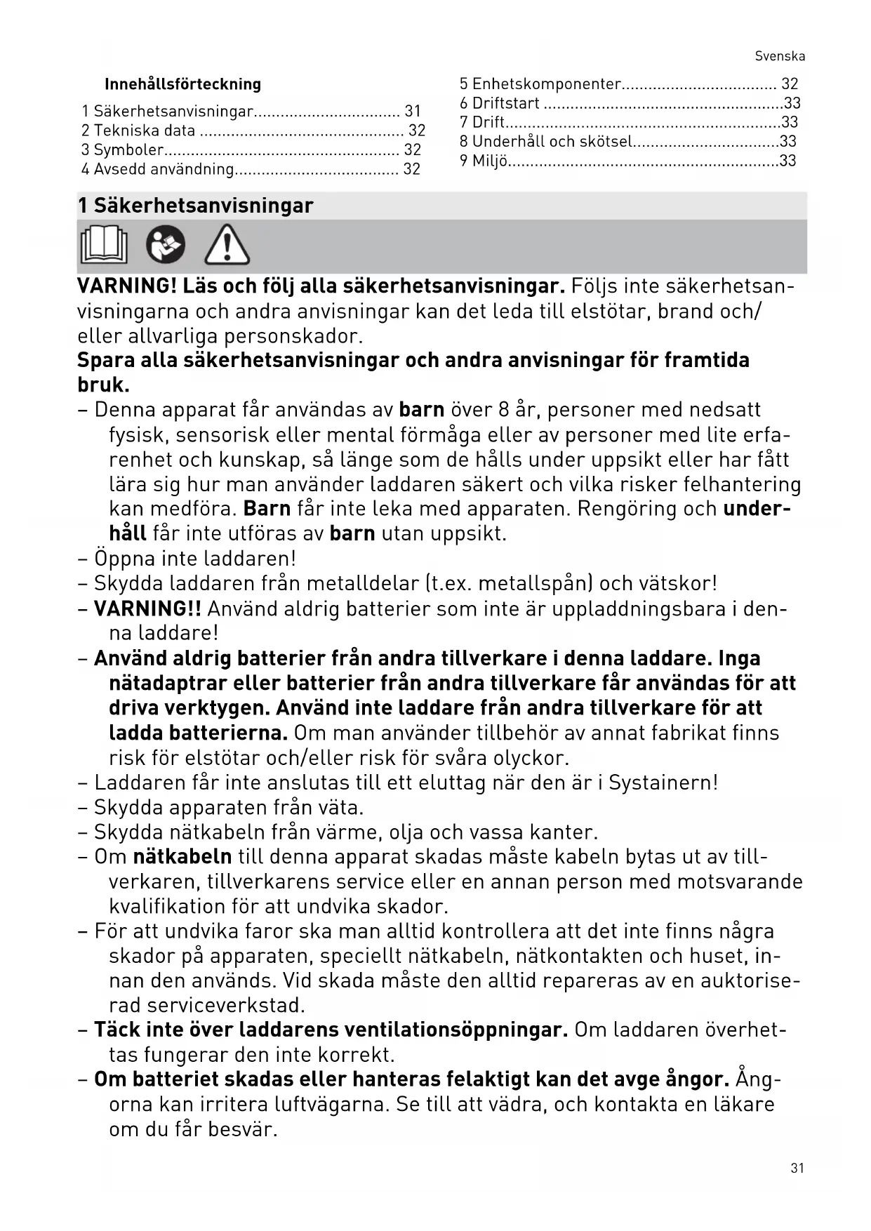 7 Drift..............................................................33 8 Underhåll och skötsel.................................33 9 Miljö.............................................................33 1 Säkerhetsanvisningar VARNING! Läs och följ alla säkerhetsanvisningar. Följs inte säkerhetsan visningarna och andra anvisningar kan det leda till elstötar, brand och/ eller allvarliga personskador. Spara alla säkerhetsanvisningar och andra anvisningar för framtida bruk. – Denna apparat får användas av barn över 8 år, personer med nedsatt fysisk, sensorisk eller mental förmåga eller av personer med lite erfa renhet och kunskap, så länge som de hålls under uppsikt eller har fått lära sig hur man använder laddaren säkert och vilka risker felhantering kan medföra. Barn får inte leka med apparaten. Rengöring och under håll får inte utföras av barn utan uppsikt. – Öppna inte laddaren! – Skydda laddaren från metalldelar (t.ex. metallspån) och vätskor! – VARNING!! Använd aldrig batterier som inte är uppladdningsbara i den na laddare! – Använd aldrig batterier från andra tillverkare i denna laddare. Inga nätadaptrar eller batterier från andra tillverkare får användas för att driva verktygen. Använd inte laddare från andra tillverkare för att ladda batterierna. Om man använder tillbehör av annat fabrikat finns risk för elstötar och/eller risk för svåra olyckor. – Laddaren får inte anslutas till ett eluttag när den är i Systainern! – Skydda apparaten från väta. – Skydda nätkabeln från värme, olja och vassa kanter. – Om nätkabeln till denna apparat skadas måste kabeln bytas ut av till verkaren, tillverkarens service eller en annan person med motsvarande kvalifikation för att undvika skador. – För att undvika faror ska man alltid kontrollera att det inte finns några skador på apparaten, speciellt nätkabeln, nätkontakten och huset, in nan den används. Vid skada måste den alltid repareras av en auktorise rad serviceverkstad. – Täck inte över laddarens ventilationsöppningar. Om laddaren överhet tas fungerar den inte korrekt. – Om batteriet skadas eller hanteras felaktigt kan det avge ångor. Ång orna kan irritera luftvägarna. Se till att vädra, och kontakta en läkare om du får besvär. Svenska 312 Tekniska data Laddare SCA 16 TCL 6 TCL 6 DUO Nätspänning (ingång) 220 - 240 V~ 220 - 240 V~ 220 - 240 V~ Nätfrekvens 50 - 60 Hz 50 - 60 Hz 50 - 60 Hz Laddningsspänning (ut gång) 10,8 - 18 V 10,8 - 18 V Output1: 10,8 - 18 V Output2: 10,8 - 18 V Laddström max. 16 A max. 6 A Output1: max. 6 A Output2: max. 6 A Laddningstider för BP- och BPC-batterier, ca 4,2 Ah 76 min 76 min 76 min 3,0 Ah* / 3,1 Ah* 33 min 33 min 33 min 4,0 Ah* 32 min 32 min 32 min 5,0 Ah* / 5,2 Ah* 33 min 45 min 45 min 6,2 Ah* 32 min 53 min 53 min Tillåtet laddtemperatur område för batteriet -5 °C till +55 °C Temperaturövervakning med NTC‐motstånd 3 Symboler Varning för allmän risk Varning för elstötar Läs bruksanvisningen och säkerhets anvisningarna! Läs bruksanvisningen och säkerhets anvisningarna! Endast lämplig för inomhusbruk