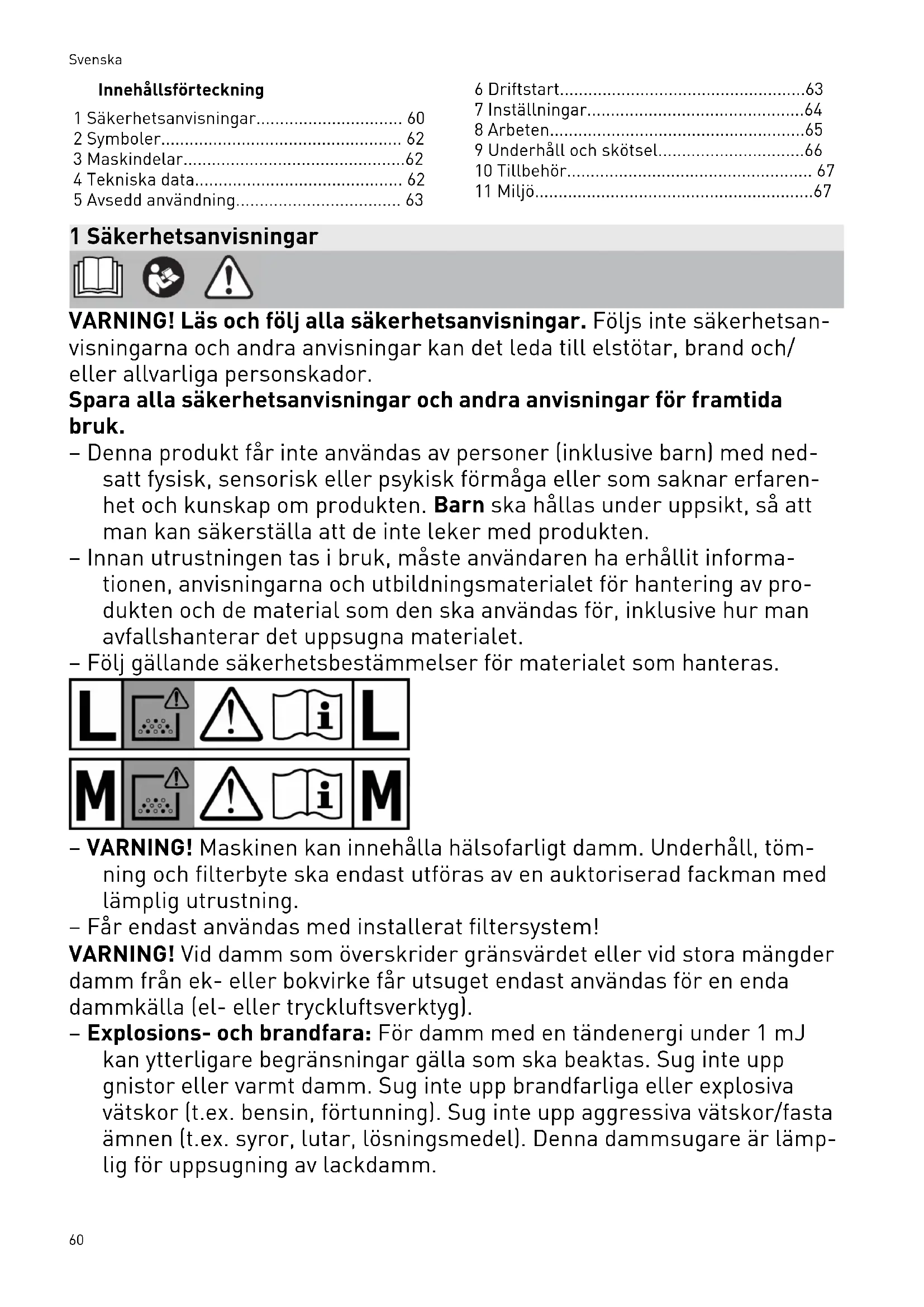 - 11 Miljö 1 Säkerhetsanvisningar VARNING! Läs och följ alla säkerhetsanvisningar. Följs inte säkerhetsan visningarna och andra anvisningar kan det leda till elstötar, brand och/ eller allvarliga personskador. Spara alla säkerhetsanvisningar och andra anvisningar för framtida bruk. – Denna produkt får inte användas av personer (inklusive barn) med ned satt fysisk, sensorisk eller psykisk förmåga eller som saknar erfaren het och kunskap om produkten. Barn ska hållas under uppsikt, så att man kan säkerställa att de inte leker med produkten. – Innan utrustningen tas i bruk, måste användaren ha erhållit informa tionen, anvisningarna och utbildningsmaterialet för hantering av pro dukten och de material som den ska användas för, inklusive hur man avfallshanterar det uppsugna materialet. – Följ gällande säkerhetsbestämmelser för materialet som hanteras. – VARNING! Maskinen kan innehålla hälsofarligt damm. Underhåll, töm ning och filterbyte ska endast utföras av en auktoriserad fackman med lämplig utrustning. – Får endast användas med installerat filtersystem! VARNING! Vid damm som överskrider gränsvärdet eller vid stora mängder damm från ek- eller bokvirke får utsuget endast användas för en enda dammkälla (el- eller tryckluftsverktyg). – Explosions- och brandfara: För damm med en tändenergi under 1mJ kan ytterligare begränsningar gälla som ska beaktas. Sug inte upp gnistor eller varmt damm. Sug inte upp brandfarliga eller explosiva vätskor (t.ex. bensin, förtunning). Sug inte upp aggressiva vätskor/fasta ämnen (t.ex. syror, lutar, lösningsmedel). Denna dammsugare är lämp lig för uppsugning av lackdamm. Svenska 60– Skada inte nätkabeln (t.ex. genom att köra över den, slita i den ). Skydda den mot varm olja och vassa kanter. Dra inte ut kontakten ur eluttaget genom att dra i kabeln. – Kontrollera regelbundet kontakten och kabeln, och låt en auktoriserad serviceverkstad byta ut dem om de är skadade. Nätkabeln får endast bytas ut mot den typ som anges i reservdelslistan. – Utsätt inte maskinen för regn. – Anslut av säkerhetsskäl maskinen endast till skyddsjordade eluttag. – Eluttagsmodulen på maskinen får endast användas för avsett ändamål. – Använd bara Festools originaltillbehör. – Dra alltid ut kontakten ur eluttaget när dammsugaren inte används samt före underhålls- och rengöringsarbeten. p. 67