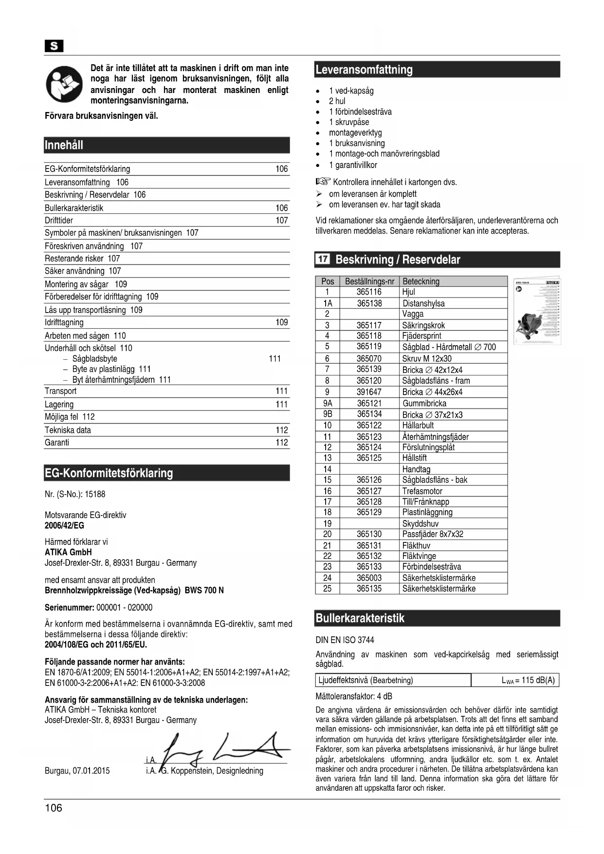 Innehåll EG-Konformitetsförklaring 106 Leveransomfattning 106 Beskrivning / Reservdelar 106 Bullerkarakteristik 106 Drifttider 107 Symboler på maskinen/ bruksanvisningen 107 Föreskriven användning 107 Resterande risker 107 Säker användning 107 Montering av sågar 109 Förberedelser för idrifttagning 109 Lås upp transportlåsning 109 Idrifttagning 109 Arbeten med sågen 110 Underhåll och skötsel 110 − Sågbladsbyte 111 − Byte av plastinlägg 111 − Byt återhämtningsfjädern 111 Transport 111 Lagering 111 Möjliga fel 112 Tekniska data 112 Garanti 112