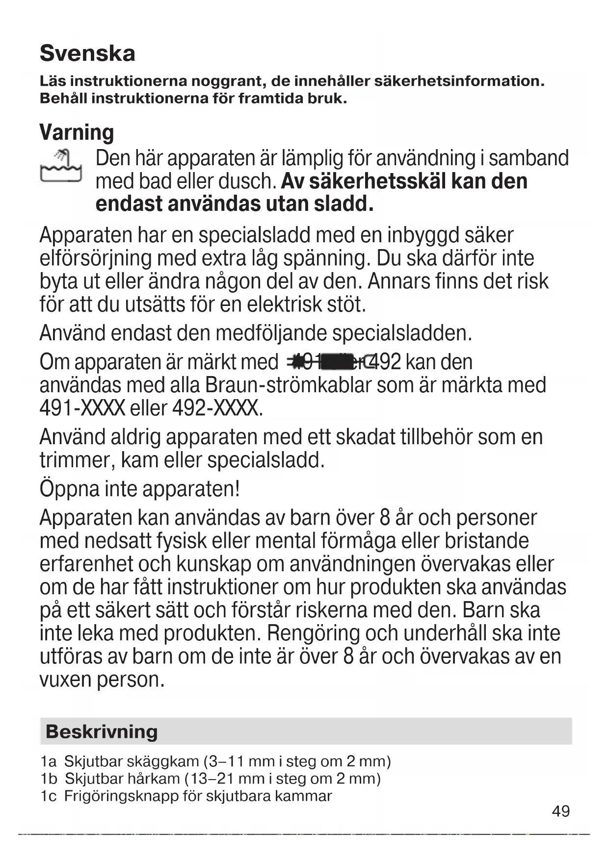 For varer kjøpt i Norge har kunden garanti i henhold til NEL’s Leverings- betingelser. 91835113_MGK_7021-7020-7920-5080_MN_ANZ.indd 4891835113_MGK_7021-7020-7920-5080_MN_ANZ.indd 48 13.04.18 10:3413.04.18 10:34 Business Use - P&G AUTHORIZED POA-00043782 Rev 001 Effective Date 2018-04-18 Printed 2019-02-27 Page 48 of 6449 Svenska Läs instruktionerna noggrant, de innehåller säkerhetsinformation. Behåll instruktionerna för framtida bruk. Varning Den här apparaten är lämplig för användning i samband med bad eller dusch. Av säkerhetsskäl kan den endast användas utan sladd. Apparaten har en specialsladd med en inbyggd säker elförsörjning med extra låg spänning. Du ska därför inte byta ut eller ändra någon del av den. Annars finns det risk för att du utsätts för en elektrisk stöt. Använd endast den medföljande specialsladden. Om apparaten är märkt med 491 eller 492 kan den användas med alla Braun-strömkablar som är märkta med 491-XXXX eller 492-XXXX. Använd aldrig apparaten med ett skadat tillbehör som en trimmer, kam eller specialsladd. Öppna inte apparaten! Apparaten kan användas av barn över 8 år och personer med nedsatt fysisk eller mental förmåga eller bristande erfarenhet och kunskap om användningen övervakas eller om de har fått instruktioner om hur produkten ska användas på ett säkert sätt och förstår riskerna med den. Barn ska inte leka med produkten. Rengöring och underhåll ska inte utföras av barn om de inte är över 8 år och övervakas av en vuxen person. Beskrivning 1a Skjutbar skäggkam (3–11 mm i steg om 2 mm) 1b Skjutbar hårkam (13–21 mm i steg om 2 mm) 1c Frigöringsknapp för skjutbara kammar 91835113_MGK_7021-7020-7920-5080_MN_ANZ.indd 4991835113_MGK_7021-7020-7920-5080_MN_ANZ.indd 49 13.04.18 10:3413.04.18 10:34 Business Use - P&G AUTHORIZED POA-00043782 Rev 001 Effective Date 2018-04-18 Printed 2019-02-27 Page 49 of 6450 1d Fixerad kam 1 (1 mm) 1e Fixerad kam 2 (2 mm) 2a Trimmerhuvud 2b Trimmerhuvud för öron och näsa* 2c Detaljtrimmerhuvud* 2d Trimmerhuvud för kroppen* 2e Mini-rakhuvud med skärblad* 3 På/av-knapp 4 Laddningsindikator 5 Stickkontakt 6 Specialsladd (utformning kan skifta) 7 Laddningsställ*