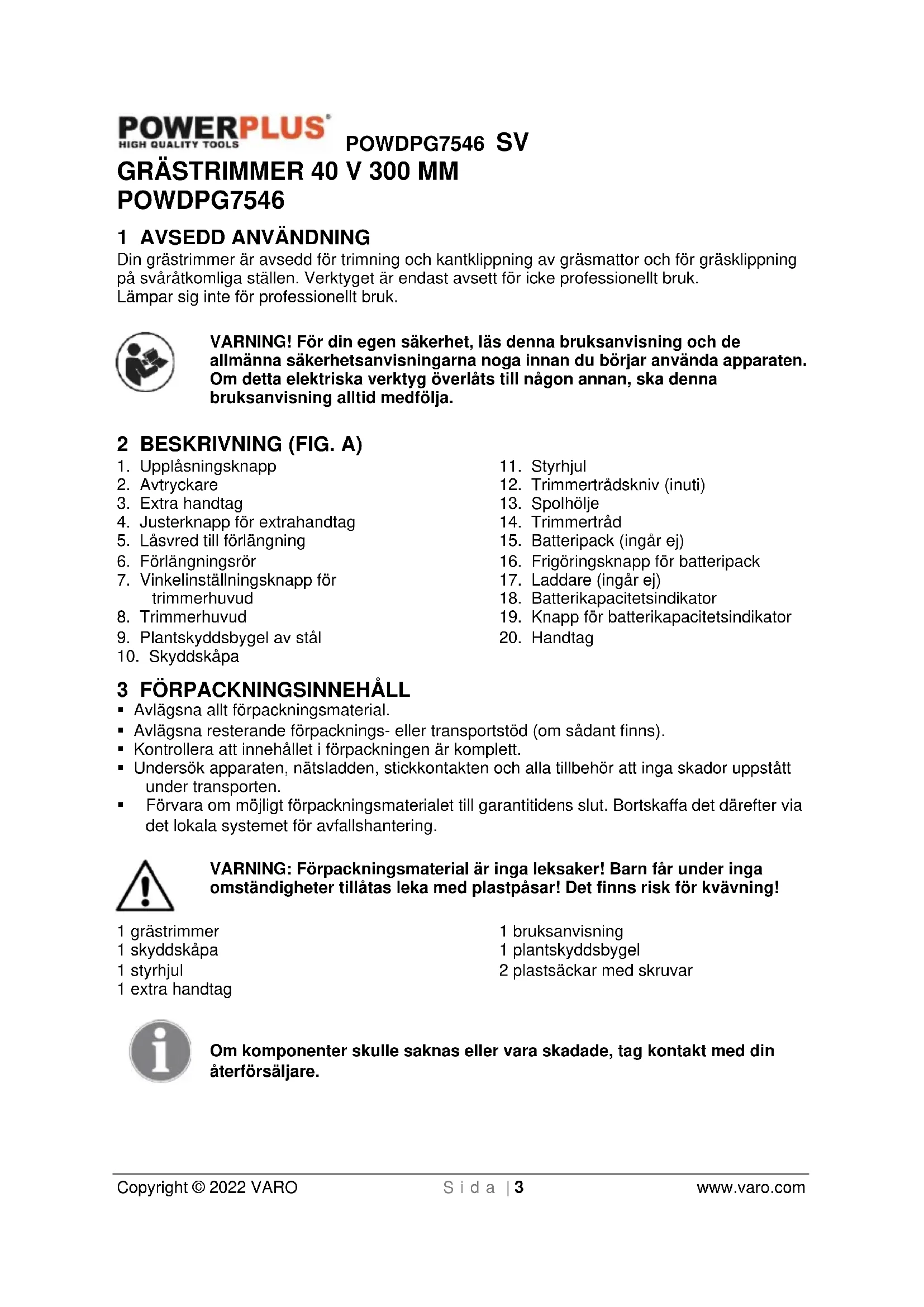 Om du efter en tid beslutar dig för att byta ut maskinen får den inte hanteras som hushållsavfall, den ska kasseras på ett miljövänligt sätt. Avfall som produceras av elektriska maskiner får inte hanteras på samma sätt som vanligt hushållsavfall. Ta avfallet till en återvinningscentral om det finns en sådan anläggning. Rådgör med lokala myndigheter eller försäljaren för rekommendationer om insamling och återvinning.POWDPG7546 SV Copyright © 2022 VARO S i d a | 12 www.varo.com