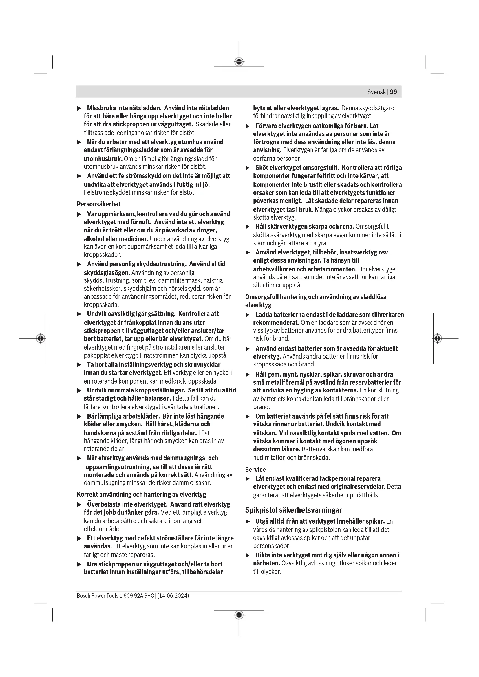 til opgaven. For hårdt underlag På beton med hård indeslutning skal du forsøge at monteret et andet sted. Ellers skal du bruge alternative fastgørelsesmetoder som f.eks. dyvler. Sømmene sidder ikke i stål. For tyndt stålunderlag Brug alternative fastgørelsesmetoder som f.eks. skruer. Søm kommer ikke ud af kon- taktelementet, eller kontakte- lementet forbliver inde. Blokering i kontaktelementet (f.eks. fremmedlegemer eller snavs) Fjern blokeringen (se "Afhjælpning af blokering/nulstilling", Side95). Bosch Power Tools 1 609 92A 9HC | (14.06.2024)98 | Svensk Problem Årsag Afhjælpning For høj fejlfrekvens For hårdt underlag Brug alternative fastgørelsesmetoder som f.eks. dyvler. Slidt slagstempel Få repareret el-værktøjet på et autoriseret serviceværksted for Bosch -el-værktøj. Søm glider ikke ind i magasi- net. Snavset magasin Rengør magasinet(12), f.eks. med en pensel. Kundeservice og anvendelsesrådgivning Kundeservice besvarer dine spørgsmål vedr. reparation og vedligeholdelse af dit produkt samt reservedele. Eksplo- sionstegninger og oplysninger om reservedele finder du også på: www.bosch-pt.com Bosch-anvendelsesrådgivningsteamet hjælper dig gerne, hvis du har spørgsmål til produkter og tilbehørsdele. Produktets 10‑cifrede typenummer (se typeskilt) skal altid angives ved forespørgsler og bestilling af reservedele. Dansk Bosch Service Center Telegrafvej 3 2750 Ballerup På www.bosch-pt.dk kan der online bestilles reservedele el- ler oprettes en reparations ordre. Tlf. Service Center: 44898855 Fax: 44898755 E-Mail: vaerktoej@dk.bosch.com Du finder adresser til andre værksteder på: www.bosch-pt.com/serviceaddresses Transport De anbefalede lithium-ion-akkuer overholder bestemmelser- ne om farligt gods. Akkuerne kan transporteres af brugeren på offentlig vej uden yderligere pålæg. Ved forsendelse gennem tredjemand (f.eks. lufttransport el- ler spedition) skal særlige krav vedrørende emballage og mærkning overholdes. Kontakt en ekspert i farligt gods, før forsendelsen forberedes. Send kun akkuer, hvis huset er ubeskadiget. Tilklæb åbne kontakter, og indpak akkuen på en sådan måde, at den ikke kan bevæge sig i emballagen. Følg venligst også eventuelle, videreførende, nationale forskrifter. Bortskaffelse El-værktøj, akku, tilbehør og emballage skal genbruges på en miljøvenlig måde. Smid ikke el-værktøj og akkuer/batterier ud sammen med det almindelige husholdningsaf- fald! Gælder kun i EU‑lande: Udtjent el-værktøj og defekte eller udtjente akkuer/batterier skal bortskaffes separat. Brug det gældende afleveringssy- stem. Ved forkert bortskaffelse kan elektrisk og elektronisk affald have skadelige virkninger på miljøet og menneskers sundhed på grund af den mulige tilstedeværelse af farlige stoffer. Akkuer/batterier: Li-Ion: Vær opmærksom på anvisningerne i afsnittet "Transport" (se "Transport", Side98). Svensk Säkerhetsanvisningar Allmänna säkerhetsanvisningar för elverktyg VARNING Läs noga igenom alla säkerhetsanvisningar och instruktioner. Fel som uppstår till följd av att säkerhetsanvisningarna och instruktionerna inte följts kan orsaka elstöt, brand och/eller allvarliga personskador. Förvara alla varningar och anvisningar för framtida bruk. Begreppet Elverktyg hänför sig till nätdrivna elverktyg (med nätsladd) och till batteridrivna elverktyg (sladdlösa). Arbetsplatssäkerhet u Håll ditt arbetsområde rent och väl upplyst. Ostädade och mörka areor ökar olycksrisken. u Använd inte elverktyget i explosionsfarliga omgivningar när det t.ex. finns brännbara vätskor, gaser eller damm. Elverktygen alstrar gnistor som kan antända dammet eller gaserna. u Håll under arbetet med elverktyget barn och obehöriga personer på betryggande avstånd. Om du störs av obehöriga personer kan du förlora kontrollen över elverktyget. Elektrisk säkerhet u Elverktygets stickpropp måste passa till vägguttaget. Stickproppen får absolut inte förändras. Använd inte adapterkontakter tillsammans med skyddsjordade elverktyg. Oförändrade stickproppar och passande vägguttag reducerar risken för elstöt. u Undvik kroppskontakt med jordade ytor som t.ex. rör, värmeelement, spisar och kylskåp. Det finns en större risk för elstöt om din kropp är jordad. u Skydda elverktyg mot regn och väta. Tränger vatten in i ett elverktyg ökar risken för elstöt. 1 609 92A 9HC | (14.06.2024) Bosch Power ToolsSvensk | 99 u Missbruka inte nätsladden. Använd inte nätsladden för att bära eller hänga upp elverktyget och inte heller för att dra stickproppen ur vägguttaget. Skadade eller tilltrasslade ledningar ökar risken för elstöt. u När du arbetar med ett elverktyg utomhus använd endast förlängningssladdar som är avsedda för utomhusbruk. Om en lämplig förlängningssladd för utomhusbruk används minskar risken för elstöt. u Använd ett felströmsskydd om det inte är möjligt att undvika att elverktyget används i fuktig miljö. Felströmsskyddet minskar risken för elstöt. Personsäkerhet u Var uppmärksam, kontrollera vad du gör och använd elverktyget med förnuft. Använd inte ett elverktyg när du är trött eller om du är påverkad av droger, alkohol eller mediciner. Under användning av elverktyg kan även en kort ouppmärksamhet leda till allvarliga kroppsskador. u Använd personlig skyddsutrustning. Använd alltid skyddsglasögon. Användning av personlig skyddsutrustning, som t. ex. dammfiltermask, halkfria säkerhetsskor, skyddshjälm och hörselskydd, som är anpassade för användningsområdet, reducerar risken för kroppsskada. u Undvik oavsiktlig igångsättning. Kontrollera att elverktyget är frånkopplat innan du ansluter stickproppen till vägguttaget och/eller ansluter/tar bort batteriet, tar upp eller bär elverktyget. Om du bär elverktyget med fingret på strömställaren eller ansluter påkopplat elverktyg till nätströmmen kan olycka uppstå. u Ta bort alla inställnings