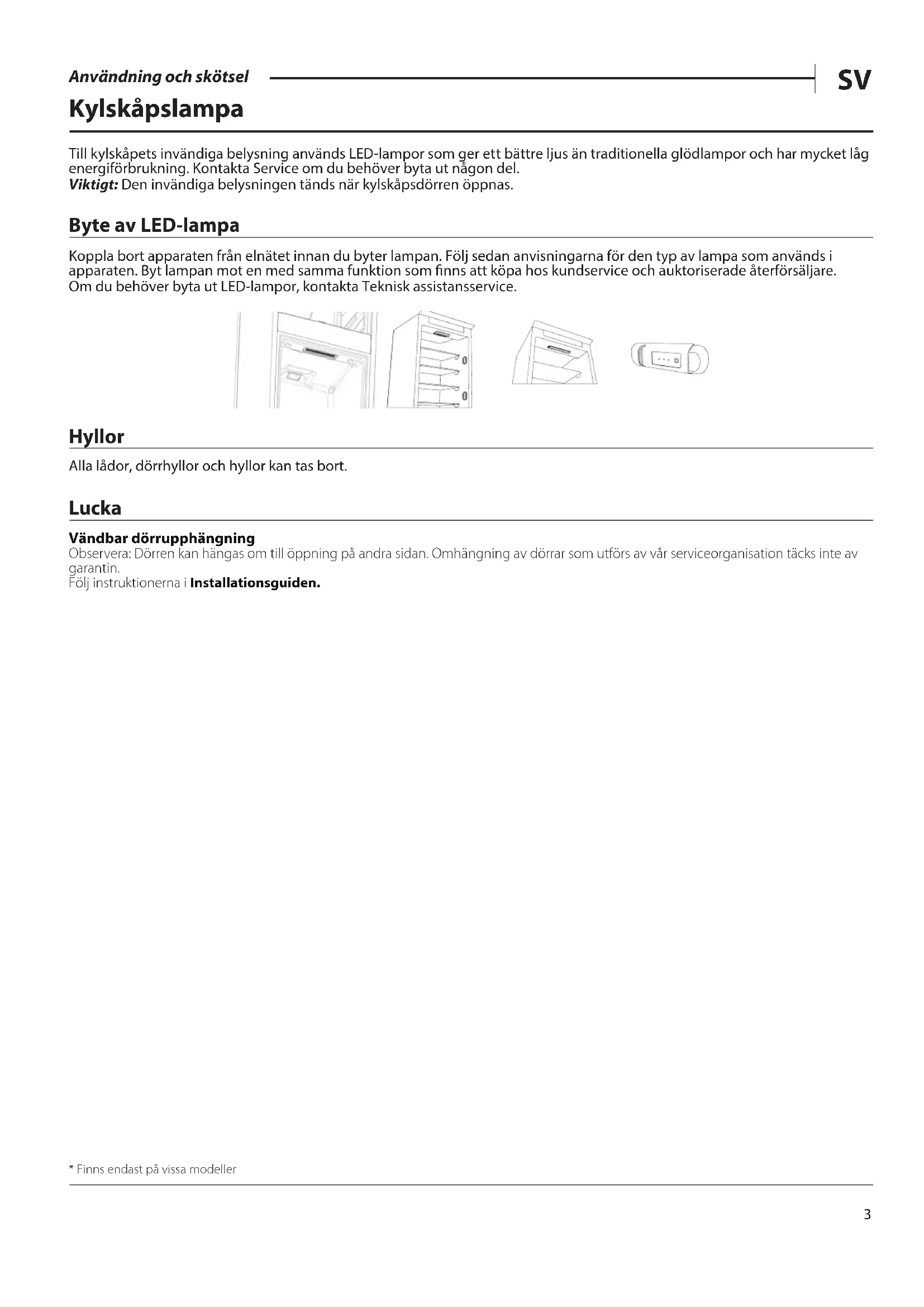 Användning och skötsel Kylskåpslampa Till kylskåpets invändiga belysning används LED-lampor som ger ett bättre ljus än traditionella glödlampor och har mycket låg energiförbrukning. Kontakta Service om du behöver byta ut någon del. Viktigt: Den invändiga belysningen tänds när kylskåpsdörren öppnas. Byte av LED-lampa Koppla bort apparaten från elnätet innan du byter lampan. Följ sedan anvisningarna för den typ av lampa som används i apparaten. Byt lampan mot en med samma funktion som nns att köpa hos kundservice och auktoriserade återförsäljare. Om du behöver byta ut LED-lampor, kontakta Teknisk assistansservice. Hyllor Alla lådor, dörrhyllor och hyllor kan tas bort. Lucka Vändbar dörrupphängning Observera: Dörren kan hängas om till öppning på andra sidan. Omhängning av dörrar som utförs av vår serviceorganisation täcks inte av garantin.Följ instruktionerna i Installationsguiden.* Finns endast på vissa modeller4 Användning och skötsel Hur man använder apparaten Användning första gången Vänta minst två timmar efter installationen innan du ansluter apparaten till elnätet. När stickkontakten ansluts i vägguttaget sätts kylskåpet automatiskt i funktion. De idealiska förvaringstemperaturerna har ställts in på fabriken. När kylskåpet slås på tar det 4–6 timmar innan det uppnår korrekt förvaringstemperatur. Placera det antibakteriella ltret med lukthämmande eekt i äkten enligt anvisningarna på förpackningen (i förekommande fall). Om en ljudsignal hörs betyder det att temperaturlarmet har aktiverats: Tryck på knappen som tystar ljudlarmet. Kylskåpsdel och förvaring av mat Kyldelen passar för förvaring av färska livsmedel och drycker. Avfrostning av kyldelen sker automatiskt. Under automatisk avfrostning förekommer vattendroppar på kyldelens bakre panel. Avfrostningsvattnet leds till ett dräneringshål och samlas sedan upp i en behållare där det förångas. Observera: Omgivningstemperaturen, hur ofta dörrarna öppnas och apparatens placering kan påverka den invändiga temperaturen i de två utrymmena. Ställ in temperaturen beroende på dessa faktorer. Om omgivningen är mycket fuktig kan kondens bildas i kyldelen, framför allt på glashyllorna. Vi rekommenderar att du stänger behållare som innehåller vätskor (t.ex. buljong), slår in produkter med hög vattenhalt (t.ex. grönsaker) och slår på fläkten (finns på vissa modeller). Alla lådor, dörrhyllor och hyllor kan tas bort. Luftdistribution med multiflöde Multiödet hjälper till att fördela den kalla luften jämnt för att bättre bevara livsmedlen. Livsmedel kan placeras på vilken hylla som helst i vitvaran. Var försiktig så att du inte blockerar luftdistributionsöppningarna som garanterar luftens fria cirkulation. Förvaring av färska matvaror och drycker Livsmedel som avger en stor mängd etylengas (äpplen, aprikoser, päron, persikor, avokado, kon, plommon, blåbär, melon, bönor) och de som är känsliga för denna gas, såsom frukt, grönsaker och sallad, bör alltid separeras eller lindas in för att inte minska hållbarhetstiden Till exempel ska inte tomater förvaras tillsammans med kiwi eller kål. Förvara inte matvaror tätt intill varandra för att tillåta att luften cirkulerar fritt. Använd behållare av återvinningsbar plast, metall, aluminium, glas och plastfolie för att slå in maten. Om du bara har en liten mängd matvaror att förvara i kylskåpet rekommenderar vi att använda hyllorna ovanför frukt- och grönsakslådan eftersom det är den svalaste delen av kylskåpet. Förvara vätska och mat som kan avge eller dra åt sig lukt eller smak i stängda behållare eller täck över dem. Använd askhållaren för att undvika att askor välter (nns på vissa modeller).