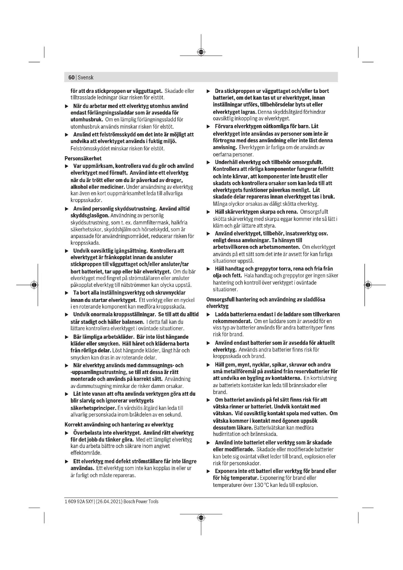 M6 2.71 3.61 4.52 4.8 5.42 6.02 7.22 8.13 9.7 13.6 16.2 M8 6.57 8.7 11 11.6 13.1 14.6 17.5 19.7 23 33 39 M10 13 17.5 22 23 26 29 35 39 47 65 78 M12 22.6 30 37.6 40 45 50 60 67 80 113 135 M14 36 48 60 65 72 79 95 107 130 180 215 M16 55 73 92 98 110 122 147 165 196 275 330 Tips Før større og længere skruer skrues i hårde materialer, før du forbore til ca. 2/3 af skruelængden med gevindets kerne- diameter. Bemærk: Sørg for, at små metaldele ikke trænger ind i el‑værktøjet. Bælteholdeclip Med bælteholdeclippen kan du hænge el-værktøjet fast i f.eks. et bælte. Derved har du begge hænder fri og el-værk- tøjet er lige ved hånden. Henvisninger til optimal håndtering af akkuen Beskyt akkuen mod fugtighed og vand. Opbevar kun akkuen i et temperaturområde fra −20°C til 50°C. Opbevar ikke akkuen i bilen f.eks. om sommeren. Rengør akkuens ventilationsåbninger en gang imellem med en blød, ren og tør pensel. Når driftstiden pr. opladning forkortes væsentligt, er det tegn på, at akkuerne er slidt op og skal udskiftes. Læs og overhold henvisningerne mht. bortskaffelse. Vedligeholdelse og service Vedligeholdelse og rengøring u Tag altid akkuen ud af el‑værktøjet, før der arbejdes på el‑værktøjet (f.eks. vedligeholdelse, værktøjsskift osv.) samt før det transporteres og lægges til opbeva- ring. Utilsigtet aktivering af start-stop-kontakten er for- bundet med kvæstelsesfare. u El‑værktøj og el‑værktøjets ventilationsåbninger skal altid holdes rene for at sikre et godt og sikkert ar- bejde. Udskiftning af kontaktkul (sebilledeD) Kontrollér kontaktkullenes længde ca. hver 2–3 måned, og skift begge kontaktkul efter behov. Skift aldrig kun en af kontaktkullene! Henvisning: Anvend kun kontaktkul, der er beregnet til dit produkt og som sælges af Bosch. – Løsn kapperne (14) med en egnet skruetrækker. – Skift de kul, der står under fjedertryk (13), og skru kap- perne på igen. Kundeservice og anvendelsesrådgivning Kundeservice besvarer dine spørgsmål vedr. reparation og vedligeholdelse af dit produkt samt reservedele. Eksplo- 1 609 92A 5XY | (26.04.2021) Bosch Power ToolsSvensk | 59 sionstegninger og oplysninger om reservedele finder du også på: www.bosch-pt.com Bosch-anvendelsesrådgivningsteamet hjælper dig gerne, hvis du har spørgsmål til produkter og tilbehørsdele. Produktets 10‑cifrede typenummer (se typeskilt) skal altid angives ved forespørgsler og bestilling af reservedele. Dansk Bosch Service Center Telegrafvej 3 2750 Ballerup På www.bosch-pt.dk kan der online bestilles reservedele el- ler oprettes en reparations ordre. Tlf. Service Center: 44898855 Fax: 44898755 E-Mail: vaerktoej@dk.bosch.com Du finder adresser til andre værksteder på: www.bosch-pt.com/serviceaddresses Transport De indeholdte Li-Ion-akkuer overholder bestemmelserne om farligt gods. Akkuerne kan transporteres af brugeren på of- fentlig vej uden yderligere pålæg. Ved forsendelse gennem tredjemand (f.eks.: lufttransport el- ler spedition) skal særlige krav vedr. emballage og mærkning overholdes. Her skal man kontakte en faregodsekspert, før forsendelsesstykket forberedes. Send kun akkuer, hvis huset er ubeskadiget. Tilklæb åbne kontakter, og indpak akkuen på en sådan måde, at den ikke kan bevæge sig i emballagen. Følg venligst også eventuelle, videreførende, nationale forskrifter. Bortskaffelse El-værktøj, akku, tilbehør og emballage skal genbruges på en miljøvenlig måde. Smid ikke el-værktøj og akkuer/batterier ud sammen med det almindelige husholdningsaf- fald! Gælder kun i EU‑lande: Iht. det europæiske direktiv 2012/19/EU skal kasseret el- værktøj og iht. det europæiske direktiv 2006/66/EF skal de- fekte eller opbrugte akkuer/batterier indsamles separat og genbruges iht. gældende miljøforskrifter. Akkuer/batterier: Li-Ion: Vær opmærksom på anvisningerne i afsnittet "Transport" (se "Transport", Side59). Vedligeholdelse og rengøring u Tag altid akkuen ud af el‑værktøjet, før der arbejdes på el‑værktøjet (f.eks. vedligeholdelse, værktøjsskift osv.) samt før det transporteres og lægges til opbeva- ring. Utilsigtet aktivering af start-stop-kontakten er for- bundet med kvæstelsesfare. u El‑værktøj og el‑værktøjets ventilationsåbninger skal altid holdes rene for at sikre et godt og sikkert ar- bejde. Udskiftning af kontaktkul (sebilledeD) Kontrollér kontaktkullenes længde ca. hver 2–3 måned, og skift begge kontaktkul efter behov. Skift aldrig kun en af kontaktkullene! Henvisning: Anvend kun kontaktkul, der er beregnet til dit produkt og som sælges af Bosch. – Løsn kapperne (14) med en egnet skruetrækker. – Skift de kul, der står under fjedertryk (13), og skru kap- perne på igen. Svensk Säkerhetsanvisningar Allmänna säkerhetsanvisningar för elverktyg VARNING Läs alla säkerhetsvarningar, instruktioner och specifikationer som tillhandahålls med detta elverktyg. Fel som uppstår till följd av att instruktionerna nedan inte följts kan orsaka elstöt, brand och/eller allvarliga personskador. Förvara alla varningar och anvisningar för framtida bruk. Begreppet Elverktyg hänför sig till nätdrivna elverktyg (med nätsladd) och till batteridrivna elverktyg (sladdlösa). Arbetsplatssäkerhet u Håll ditt arbetsområde rent och väl upplyst. Ostädade och mörka areor ökar olycksrisken. u Använd inte elverktyget i explosionsfarliga omgivningar när det t.ex. finns brännbara vätskor, gaser eller damm. Elverktygen alstrar gnistor som kan antända dammet eller gaserna. u Håll under arbetet med elverktyget barn och obehöriga personer på betryggande avstånd. Om du störs av obehöriga personer kan du förlora kontrollen över elverktyget. Elektrisk säkerhet u Elverktygets stickpropp måste passa till vägguttaget. Stickproppen får absolut inte förändras. Använd inte adapterkontakter tillsammans med skyddsjordade elverktyg. Oförändrade stickproppar och passande vägguttag r