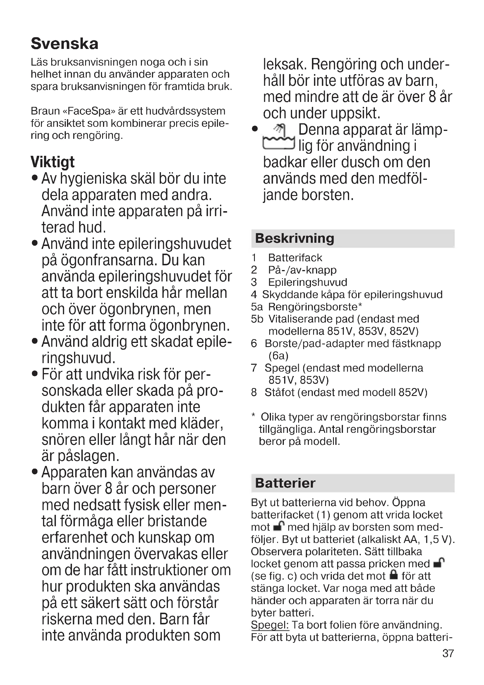 For varer kjøpt i Norge har kunden garanti i henhold til NEL’s Leveringsbetingelser. 90846664_Velvet_Face_851-853_EMEA_S4-98.indd 3690846664_Velvet_Face_851-853_EMEA_S4-98.indd 36 25.04.16 11:3025.04.16 11:30 CSS APPROVED Effective Date 22Aug2016 GMT - Printed 27Sep2016 Page 36 of 9837 Svenska Läs bruksanvisningen noga och i sin helhet innan du använder apparaten och spara bruksanvisningen för framtida bruk. Braun «FaceSpa» är ett hudvårdssystem för ansiktet som kombinerar precis epile- ring och rengöring. Viktigt