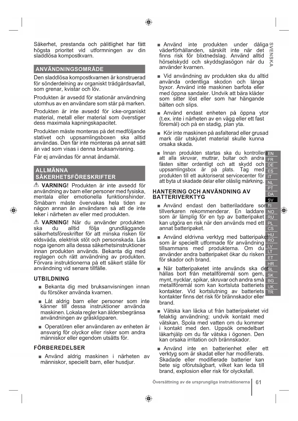 Oversættelse af de originale instruktionerSäkerhet, prestanda och pålitlighet har fått högsta prioritet vid utformningen av din sladdlösa kompostkvarn.