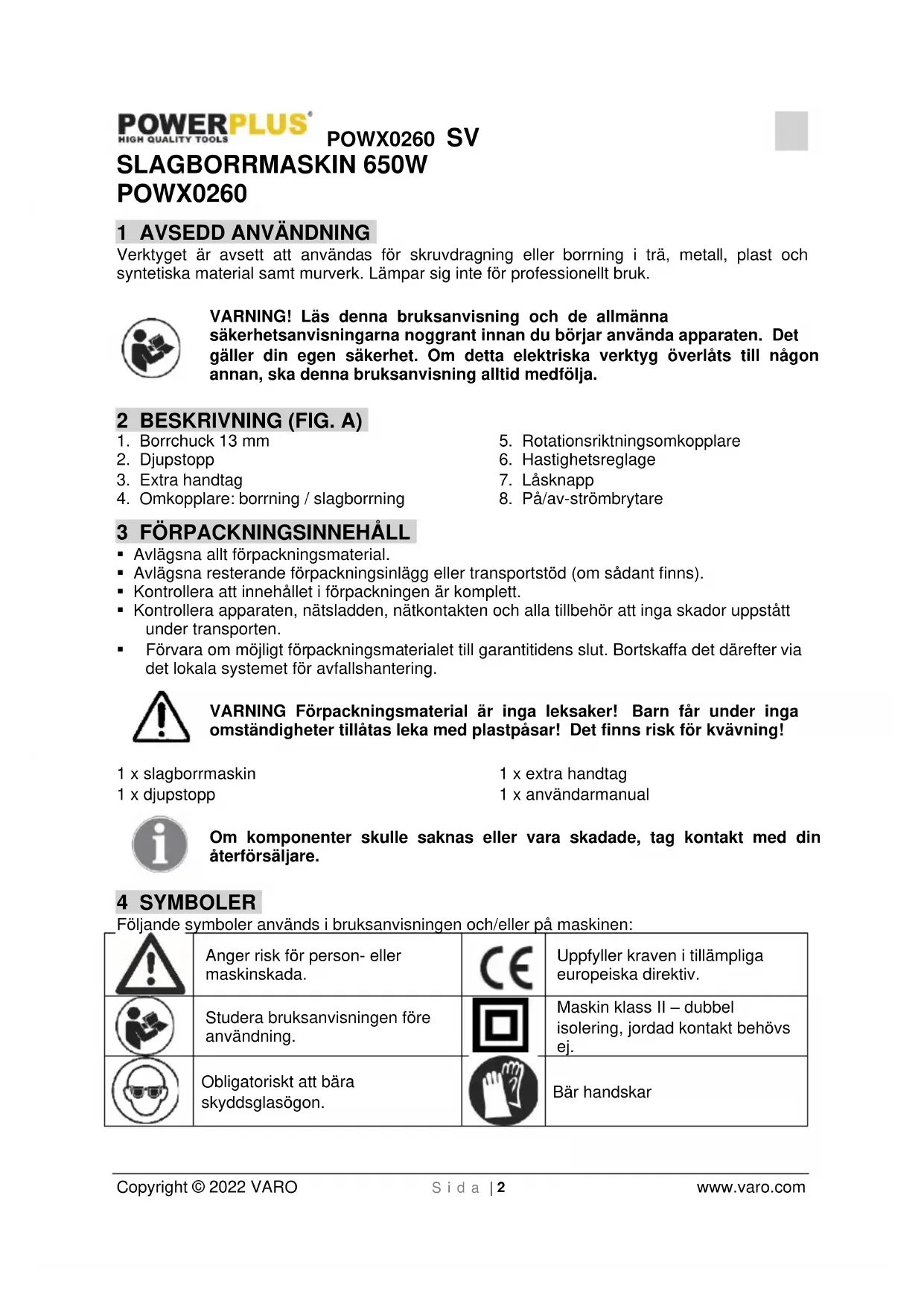 - Kontrollera att du står stadigt på stegen eller byggnadsställningen när borren används på fri hand.POWX0260 SV Copyright © 2022 VARO S i d a | 5 www.varo.com