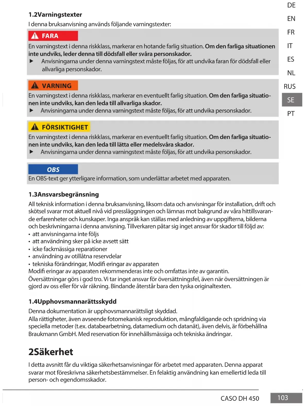 Denna bruksanvisning är beståndsdel av Torkenhet CASO DH 450 (här nedan kallad apparaten) och ger dig viktiga anvisningar för drift, säkerhet, avsedd användning och skötsel av apparaten. Bruksanvisningen måste alltid nnas till hands vid apparaten och ska läsas och tillämpas av alla som arbetar med: