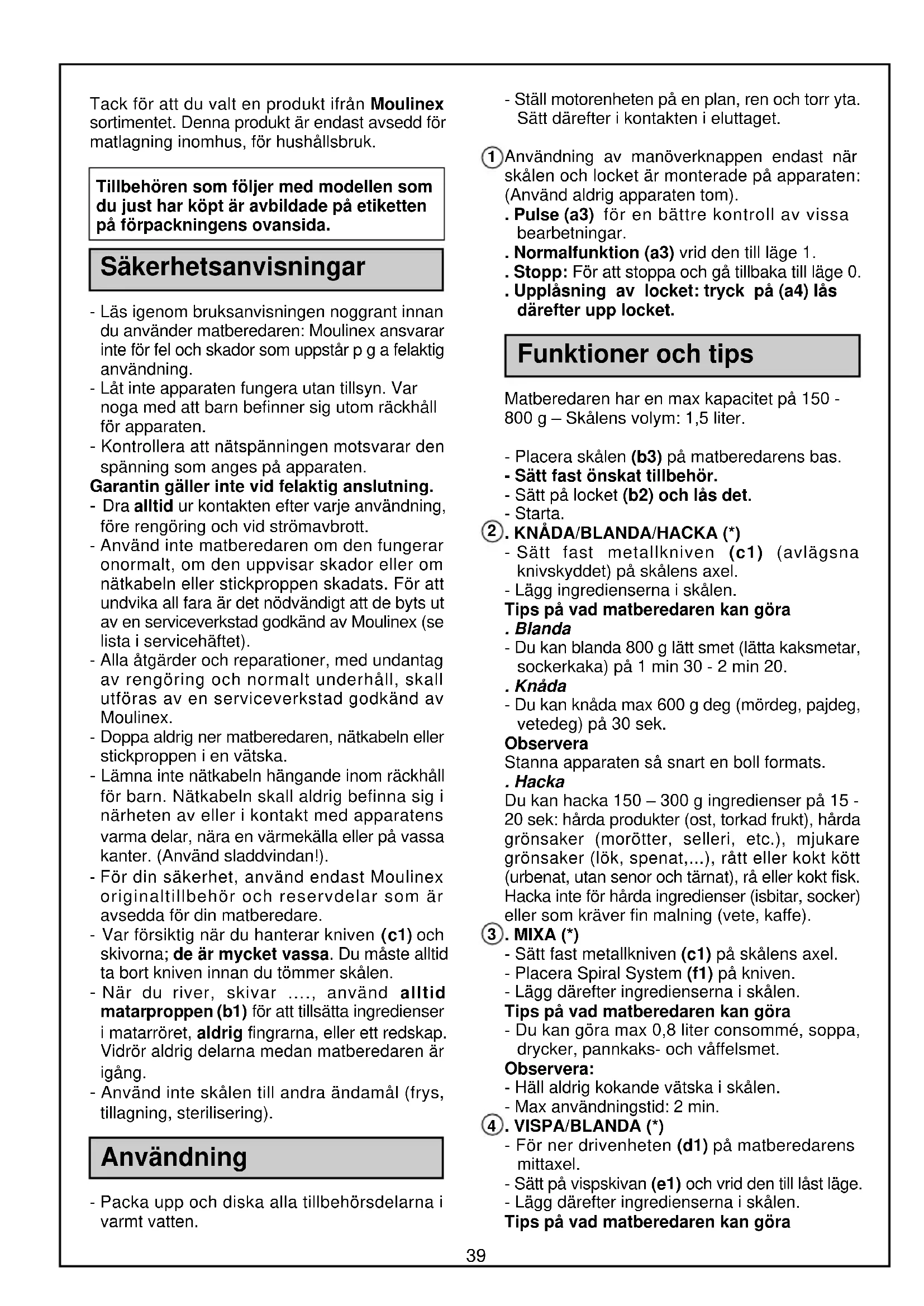 I KJØLESKAP) Paideig (Til en form på ∅ 28 cm) - I bollen utstyrt med kniven heller du 200 g mel, 100 g smør og en knivsodd salt. - Kjør kjøkkenmaskinen i 10 sekunder, og hell deretter 5 cl vann ned i materøret mens kjøkkenmaskinen er i drift. - Kjør apparatet helt til deigen er blitt til en fin ball. Mørdeig (Til en form på ∅ 28 cm) - I bollen utstyrt med kniven heller du 200 g sukker, 2 eggeplommer og 100 g mykt smør. - Kjør kjøkkenmaskinen i 30 sekunder, og hell deretter i 200 g mel, en teskje vaniljesukker og en knivsodd salt, og kjør apparatet helt til deigen er blitt til en ball. Pizzadeig (Til en pizza) - I bollen utstyrt med kniven heller du 150 g mel, 1/2 pakke tørrgjær og en knivsodd salt. - Kjør kjøkkenmaskinen i 10 sekunder, og hell deretter i 90 g lunkent vann og 2 spiseskjeer olivenolje, og kjør apparatet helt deigen er blitt en fin ball. - Heve deigen til dobbel størrelse (1 time). Legg den på platen og forme den som du ønsker. Pannekakerøre (16 tynne pannekaker) - I bollen utstyrt med kniven heller du 2 egg, 1 spiseskje olje, 15 g sukker, 1/2 liter melk og 1 spiseskje appelsinblomstvann eller en alkohol etter smak. - Kjør kjøkkenmaskinen med Spiral System i 10 sekunder, og hell deretter i ca. 200 g mel, og kjør apparatet helt til røren er blitt helt jevn. - La den hvile i 1 time. SAUSER Majones - I bollen utstyrt med emulgeringsskiven heller du 1 eggeplomme, 1 spiseskje sennep, 1 teskje eddik, salt og pepper. - Kjør kjøkkenmaskinen i 10 sekunder. Hell 25 cl olje i en tynn stråle ned i materøret i ca. 1 min. og 30 sek. med apparatet i drift. Tartar-saus - I bollen utstyrt med kniven og med majonesen, hakker du 100 g sylteagurker og 1 liten løk, klipp opp 1 urtebukett (kjørvel, gressløk, persille, delicio EU11.PM6 20/02/06, 15:373738 estragon) og ha i 2 spiseskjeer kapers, og kjør apparatet i 40 sekunder. Cocktail-saus - I bollen utstyrt med emulgeringsskiven og med majonesen, blander du 1 spiseskje tomatsaus på tube, noen dråper pikant saus av rød, spansk pepper og en anelse Worcestershire-saus, og kjør apparatet i 20 sekunder. SUPPE Purresuppe (4 personer) - Skrell 150 g purre og skjær den opp på langs. Legg den ferdig oppskjærte purren i bollen utstyrt med metallkniven, og hakk purren i 20 sekunder. Smelt 20 g smør i en kasserolle, og tilsett den hakkede purren, rør rundt, sett på lokket og la det småkoke i 15 minutter. - Skrell 150 g poteter. Skjær de i store terninger og legg de ned sammen med purren. Tilsett salt, pepper og muskat, og hell på en 1/2 liter vann og 10 cl melk. - La det koke i en 1/2 time. Etter at koketiden er over, hell innholdet i bollen utstyrt med kniven, og mikse dette i 40 sekunder med Spiral System. GRØNNSAKER Fløtegratinerte poteter (4 personer) - I kjøkkenmaskinen utstyrt med grønnsaks- snitteren og bladet (C), river du 70 g gulost. Sett den til side. Skrell 700 g poteter og skjær de i skiver i bollen utstyrt med grønnsakssnitteren og bladet (H). - Legg potetskivene i en gratengform som du har smurt med smør og et hvitløksfedd. - I bollen utstyrt med kniven heller du 2 eggeplommer, 20 cl melk, 15 cl fløte, salt, pepper og revet muskatnøtt. Bland dette i 1 minutt. - Hell blandingen over potetene. Dryss over revet gulost, og legg på noen få smørkuler. - Sett i ovnen ved termostat 7 i 1 time. COCKTAIL Bringebær-milkshake (2 personer) - 1/2 liter helmelk, 150 g bringebær, 1/2 yoghurt, 30 g sukker. - I bollen utstyrt med blender-kniven legger du alle ingrediensene, sett på plass Spiral System og lås deretter lokket på plass. - Kjør apparatet i 20 sekunder. DESSERTER Yoghurt-kake (6/8 personer) - 1 beger med yoghurt naturell (skal brukes til målebeger), 2 beger sukker, 3 beger mel, 1/2 beger olje, 3 egg, 1 pakke tørrgjær. - Hell alle ingrediensene i bollen utstyrt med kniven. - Kjør apparatet i 2 minutter. Deigen skal være helt glatt og jevn. - Hell deigen i en hulform, og sett den i ovnen ved termostat 6 i 50 minutter. Formkake (4/6 personer) - I bollen utstyrt med kniven heller du 150 g mel, 1/2 pakke tørrgjær, 150 g sukker, 150 g smør og 3 egg. - Kjør apparatet i 2 minutter. Hell deigen i en smurt og meldrysset formkakeform. - Stek kaken i ovnen ved termostat 6 i 55 minutter. Pisket krem (6/8 personer) - 25 cl godt kald fløte, 50 g melis. - I bollen utstyrt med emulgeringsskiven heller du fløten og melisen. - Kjør apparatet i 1minutt. Stivpiskede eggehviter - I bollen utstyrt med emulgeringsskiven heller du 2 til 4 eggehviter og 1 knivsodd salt. Lås lokket på plass. - Kjør apparatet helt til eggehvitene er blitt godt stive. Ikke sett nedstapperen i materøret slik at eggehvitene kan få luft. delicio EU11.PM6 20/02/06, 15:373839 Tack för att du valt en produkt ifrån Moulinex sortimentet. Denna produkt är endast avsedd för matlagning inomhus, för hushållsbruk. Tillbehören som följer med modellen som du just har köpt är avbildade på etiketten på förpackningens ovansida. Säkerhetsanvisningar - Läs igenom bruksanvisningen noggrant innan du använder matberedaren: Moulinex ansvarar inte för fel och skador som uppstår p g a felaktig användning. - Låt inte apparaten fungera utan tillsyn. Var noga med att barn befinner sig utom räckhåll för apparaten. - Kontrollera att nätspänningen motsvarar den spänning som anges på apparaten. Garantin gäller inte vid felaktig anslutning. - Dra alltid ur kontakten efter varje användning, före rengöring och vid strömavbrott. - Använd inte matberedaren om den fungerar onormalt, om den uppvisar skador eller om nätkabeln eller stickproppen skadats. För att undvika all fara är det nödvändigt att de byts ut av en serviceverkstad godkänd av Moulinex (se lista i servicehäftet). - Alla åtgärder och reparationer, med undantag av rengöring och normalt underhåll, skall utföras av en serviceverkstad godkänd av Moulinex. - Doppa aldrig ner matberedaren, nätkabeln eller stickproppen i en vätska. - Lämna 