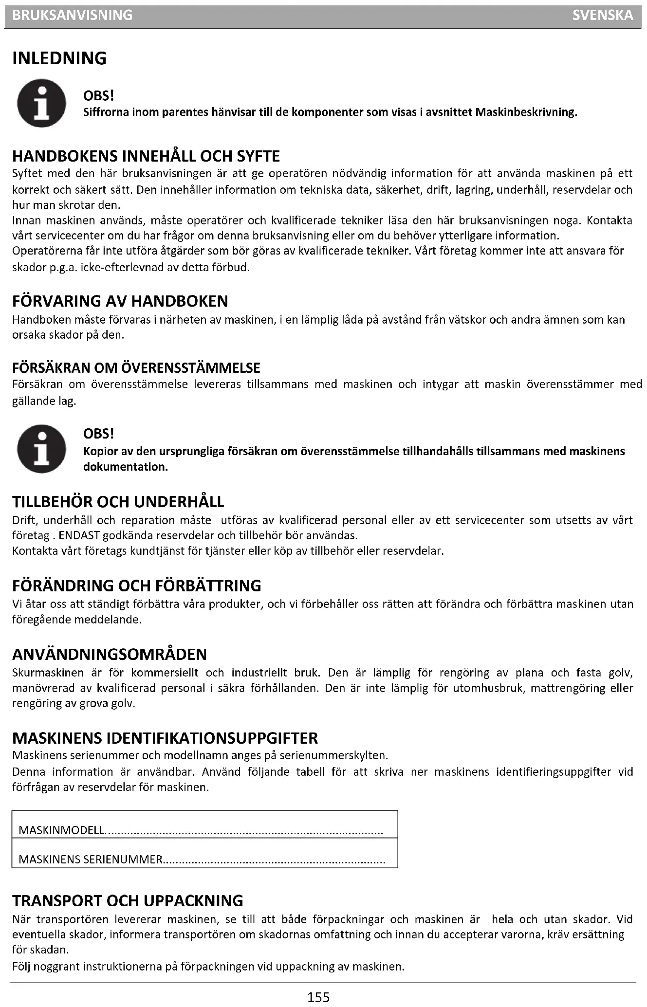 Skurmaskinen är för kommersiellt och industriellt bruk. Den är lämplig för rengöring av plana och fasta golv, manövrerad av kvalificerad personal i säkra förhållanden. Den är inte lämplig för utomhusbruk, mattrengöring eller rengöring av grova golv. MASKINENS IDENTIFIKATIONSUPPGIFTER Maskinens serienummer och modellnamn anges på serienummerskylten. Denna information är användbar. Använd följande tabell för att skriva ner maskinens identifieringsuppgifter vid förfrågan av reservdelar för maskinen. MASKINMODELL....................................................................................... MASKINENS SERIENUMMER......................................................................