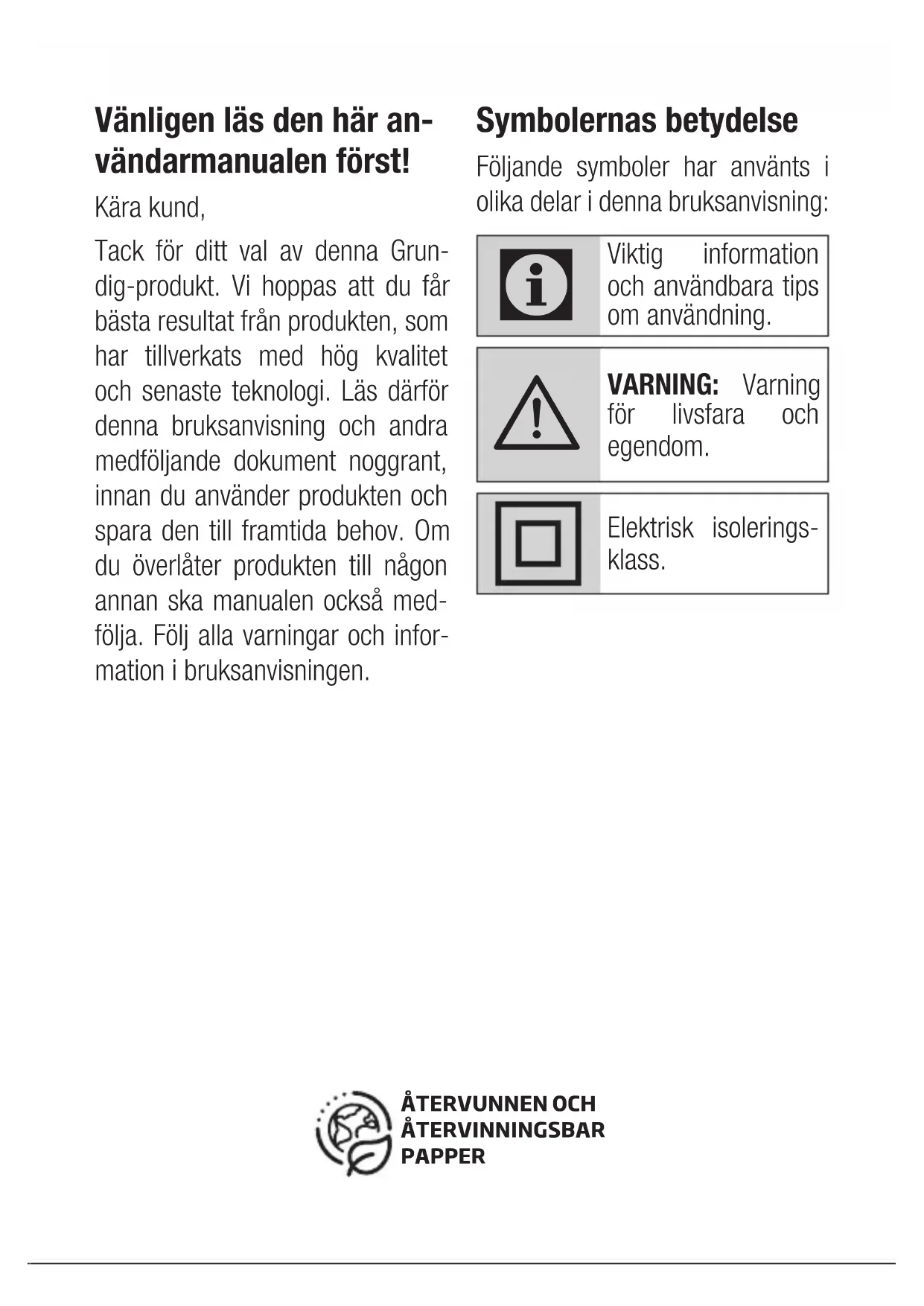 - Sørg for at apparatet holdes util- gjengelig for barn. 5 Informasjon For igangkjøring, generell bruk og rengjøring, følg instruksjonene på side 4-5-6-7-8 i denne bruksan-visningen.Vänligen läs den här an- vändarmanualen först! Kära kund, Tack för ditt val av denna Grun- dig-produkt. Vi hoppas att du får bästa resultat från produkten, som har tillverkats med hög kvalitet och senaste teknologi. Läs därför denna bruksanvisning och andra medföljande dokument noggrant, innan du använder produkten och spara den till framtida behov. Om du överlåter produkten till någon annan ska manualen också med- följa. Följ alla varningar och infor- mation i bruksanvisningen. Symbolernas betydelse Följande symboler har använts i olika delar i denna bruksanvisning: