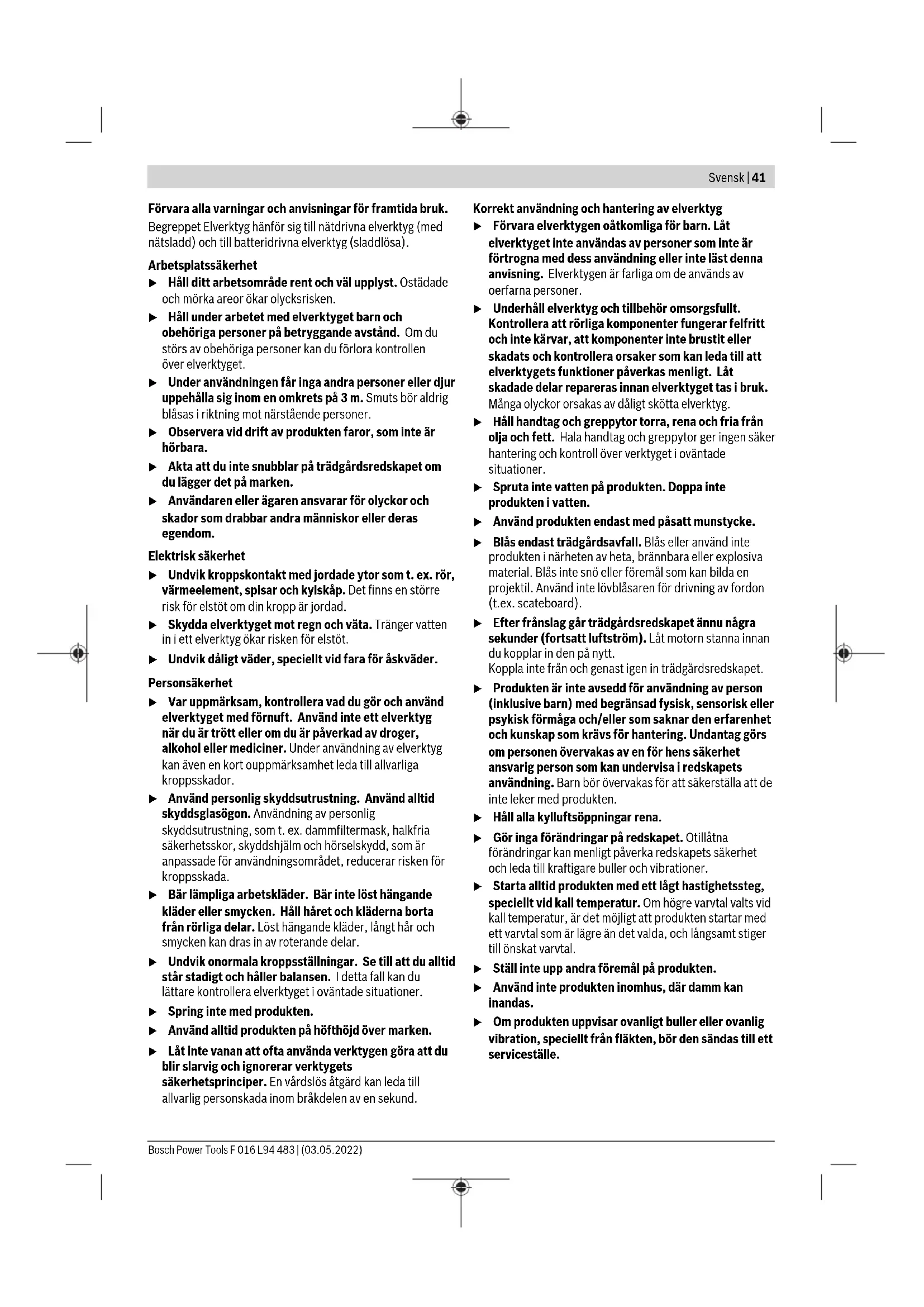 Akku er afladt Oplad akku Akkuen er ikke sat rigtigt i Sæt akkuen rigtigt i (se billede C) Akkumulatorbatteri for koldt/for varmt Opvarm/afkøl akkumulatorbatteri. Start altid produktet med et lavt omdrejningstal Haveredskab defekt Kontakt serviceforhandleren Haveredskab kører i intervaller Start-stop-kontakt er defekt Kontakt serviceforhandler Regulator til luftstrømhastighed defekt Kontakt serviceforhandleren For stor vibration/støj Haveredskab defekt Kontakt serviceforhandleren Arbejdsvarighed pr. akkuladning for lille Akku har ikke været brugt i længere tid eller kun i kort tid Oplad akku helt Defekt akku Skift akku Haveredskab blæser ikke Dyse er blokeret Afbloker dyse Reduceret luftgennem- strøm Luftindgang blokeret Frigør luftindgang Akku er for kold Start altid produktet med et lavt omdrejningstal Dyse kan ikke monte- res Forkert montering Monter dysen rigtigt (se billede B) Bosch Power Tools F 016 L94 483 | (03.05.2022)40 | Svensk Vedligeholdelse og service Vedligeholdelse, rengøring og opbevaring u Sørg for, at reparationer på produktet kun udføres af kvalificerede fagfolk, og at der kun benyttes originale reservedele. Dermed garanteres størst mulig sikkerhed. u Beskadigede batterier må aldrig repareres. Repara- tion af batterier må kun udføres af producenten eller au- toriserede reparatører. Kundeservice og anvendelsesrådgivning Kundeservice besvarer dine spørgsmål vedr. reparation og vedligeholdelse af dit produkt samt reservedele. Eksplo- sionstegninger og oplysninger om reservedele finder du også på: www.bosch-pt.com Bosch-anvendelsesrådgivningsteamet hjælper dig gerne, hvis du har spørgsmål til produkter og tilbehørsdele. Produktets 10‑cifrede typenummer (se typeskilt) skal altid angives ved forespørgsler og bestilling af reservedele. Dansk Bosch Service Center Telegrafvej 3 2750 Ballerup På www.bosch-pt.dk kan der online bestilles reservedele el- ler oprettes en reparations ordre. Tlf. Service Center: 44898855 Fax: 44898755 E-Mail: vaerktoej@dk.bosch.com Du finder adresser til andre værksteder på: www.bosch-pt.com/serviceaddresses Transport De anbefalede lithium-ion-akkuer overholder bestemmelser- ne om farligt gods. Akkuerne kan transporteres af brugeren på offentlig vej uden yderligere pålæg. Ved forsendelse gennem tredjemand (f.eks.: lufttransport el- ler spedition) skal særlige krav vedr. emballage og mærkning overholdes. Her skal man kontakte en faregodsekspert, før forsendelsesstykket forberedes. Send kun akkuer, hvis huset er ubeskadiget. Tilklæb åbne kontakter, og indpak akkuen på en sådan måde, at den ikke kan bevæge sig i emballagen. Følg venligst også eventuelle, videreførende, nationale forskrifter. Bortskaffelse Produkter, akkuer, tilbehør og emballage skal genbruges på en miljøvenlig måde. Smid hverken produkter eller akkuer/batterier ud sammen med det almindelige husholdnings- affald! Gælder kun i EU‑lande: Iht. det europæiske direktiv 2012/19/EU skal kasserede produkter og iht. det europæiske direktiv 2006/66/EF skal defekte eller opbrugte akkuer/batterier indsamles separat og genbruges iht. gældende miljøforskrifter. Ved forkert bortskaffelse kan elektrisk og elektronisk affald have skadelige virkninger på miljøet og menneskers sundhed på grund af den mulige tilstedeværelse af farlige stoffer. Akkuer/batterier: Li-Ion: Vær opmærksom på anvisningerne i afsnittet "Transport" (se "Transport", Side40). Svensk Säkerhetsanvisningar Beskrivning av symbolerna på trädgårdsredskapet Allmän varning för riskmoment. Läs noga igenom bruksanvisningen. Använd inte i regn. VARNING: Se upp för ivägslungade delar. VARNING: Håll närvarande på avstånd. Se till att du inte för händerna, fötterna eller vida kläder i öppningarna när produkten är igång. Roterande fläkt. Se till att du inte för händerna, fötterna långt hår eller vida kläder i öppningarna när produkten är igång. Bär hörselskydd och skyddsglasögon. VARNING: Avlägsna alltid batteriet före servicearbeten. Allmänna säkerhetsanvisningar för elverktyg VARNING Läs alla säkerhetsvarningar, instruktioner och specifikationer som tillhandahålls med detta elverktyg. Fel som uppstår till följd av att instruktionerna nedan inte följts kan orsaka elstöt, brand och/eller allvarliga personskador. F 016 L94 483 | (03.05.2022) Bosch Power ToolsSvensk | 41 Förvara alla varningar och anvisningar för framtida bruk. Begreppet Elverktyg hänför sig till nätdrivna elverktyg (med nätsladd) och till batteridrivna elverktyg (sladdlösa). Arbetsplatssäkerhet u Håll ditt arbetsområde rent och väl upplyst. Ostädade och mörka areor ökar olycksrisken. u Håll under arbetet med elverktyget barn och obehöriga personer på betryggande avstånd. Om du störs av obehöriga personer kan du förlora kontrollen över elverktyget. u Under användningen får inga andra personer eller djur uppehålla sig inom en omkrets på 3 m. Smuts bör aldrig blåsas i riktning mot närstående personer. u Observera vid drift av produkten faror, som inte är hörbara. u Akta att du inte snubblar på trädgårdsredskapet om du lägger det på marken. u Användaren eller ägaren ansvarar för olyckor och skador som drabbar andra människor eller deras egendom. Elektrisk säkerhet u Undvik kroppskontakt med jordade ytor som t.ex. rör, värmeelement, spisar och kylskåp. Det finns en större risk för elstöt om din kropp är jordad. u Skydda elverktyget mot regn och väta. Tränger vatten in i ett elverktyg ökar risken för elstöt. u Undvik dåligt väder, speciellt vid fara för åskväder. Personsäkerhet u Var uppmärksam, kontrollera vad du gör och använd elverktyget med förnuft. Använd inte ett elverktyg när du är trött eller om du är påverkad av droger, alkohol eller mediciner. Under användning av elverktyg kan även en kort ouppmärksamhet leda till allvarliga kroppsskador. u Använd personlig skyddsutrustning. Använd alltid sk