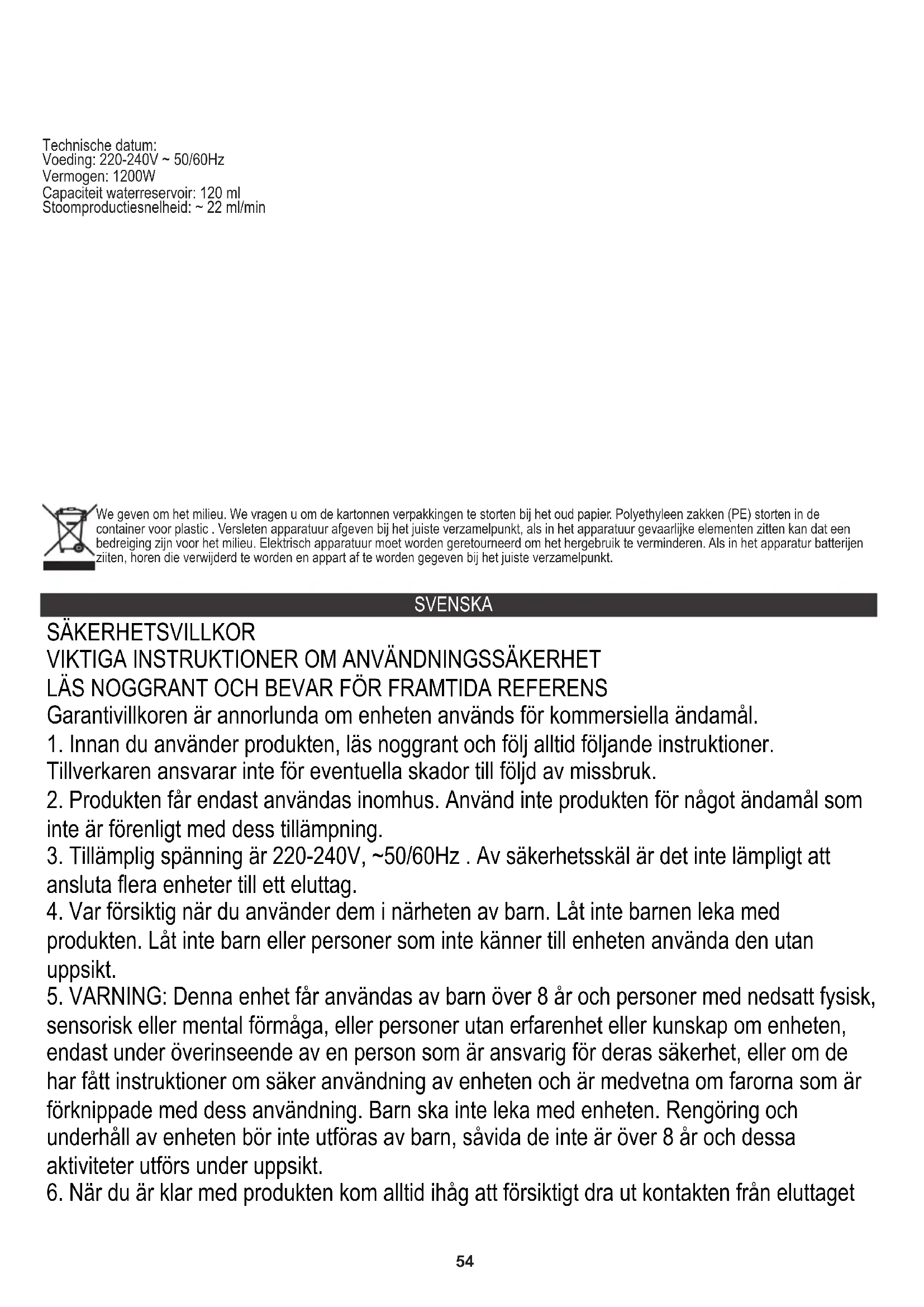 OBS: Innan du rengör, se till att produkten har stängts av och kopplats bort från strömförsörjningen. Se också till att produkten och komponenterna/tillbehören har svalnat. Steg 1: Efter användning av produkten måste det återstående vattnet i vattenbehållaren hällas från enheten och lämnas för att lufttorka, för att undvika att kalk bildas inuti vattenbehållaren. Steg 2: Använd inte hårda eller vassa föremål för att rengöra produkten eller andra komponenter för att undvika skador. Steg 3: Ta trasan och använd ett milt rengöringsmedel för att rengöra trasan noggrant. Låt den lufttorka ordentligt innan den används eller förvaras vidare. Steg 5: Använd en mjuk våt trasa för att rengöra maskinkroppen, munstycket och alla andra tillbehör. Använd sedan en torr mjuk trasa för att torka av produkten. Steg 4: Lägg produkten och tillbehören på en torr och sval plats utom räckhåll för barn eller djur. Steg 5: Om produkten inte används under en längre tid kan du ta isär produkten. ANTECKNINGSBOK: Efter kylning av produkten kommer het ånga att bli vattenånga efter kylning. En del vattenånga kommer att samlas i ångmunstycket och blir vattendroppar, vilket är ett normalt fenomen – så se till att låta det torka helt. Rengöringsdukar kan tvättas i maskin vid låga temperaturer (upp till 30 C). Lägg inte rengöringsdukar i en elektrisk torktumlare. lufttorka den. Rengöringsduken är en förbrukningsvara. Byt ut mot en ny rengöringsduk när det är lämpligt. Om du inte gör det kommer det att påverka enhetens effektivitet. Om rengöringsduken börjar lossna, klipp av de lösa trådarna försiktigt och dra inte i dem. Om produkten blir blockerad av kalk , blanda en del citronsyra med tre delar vatten. Häll denna blandning i vattenbehållaren och låt stå i 6 timmar. Slå sedan PÅ enheten över en icke-citronsyra-/vattenbeständig yta. FELSÖKNING Om det finns ett problem med din produkt, kontrollera följande detaljer innan du begär service till din återförsäljare. problem: Ingen ånga Möjlig lösning: Kontrollera om enheten är ansluten till strömförsörjningen. Kontrollera om strömbrytaren och ångströmbrytaren är i PÅ-läget Kontrollera vattennivån. problem: Fungerar ej Möjlig lösning: Kontrollera om enhetens strömknapp är påslagen och kabeln är ansluten till strömförsörjningen. problem: Produkten blockeras av kalk Möjlig lösning: Blanda en del citronsyra med tre delar vatten. Häll denna blandning i vattenbehållaren och låt stå i 6 timmar. Slå sedan PÅ enheten över en icke-citronsyra/vattenbeständig yta. Tekniskt datum: Strömförsörjning: 220-240V ~ 50/60Hz Effekt: 1200W Vattenbehållarens kapacitet: 120ml Utmatningshastighet för ånga: ~22ml/min Vi sköter om miljön. Överlämna förpackningar i kartong till pappersavfall. Polyetylensäckar (PE) slängs i avfallsbehållare för plast. Man bör lämna en gammal apparat till en riktig återvinningscentral, eftersom farliga komponenter i apparaten kan orsaka fara till miljön. En elektrisk apparat bör lämnas för att minska förnyad användning av denna. Om apparaten innehåller batterier, bör man ta bort dem och lämna dem separat till återvinningscentraler.58 SLOVENŠČINA