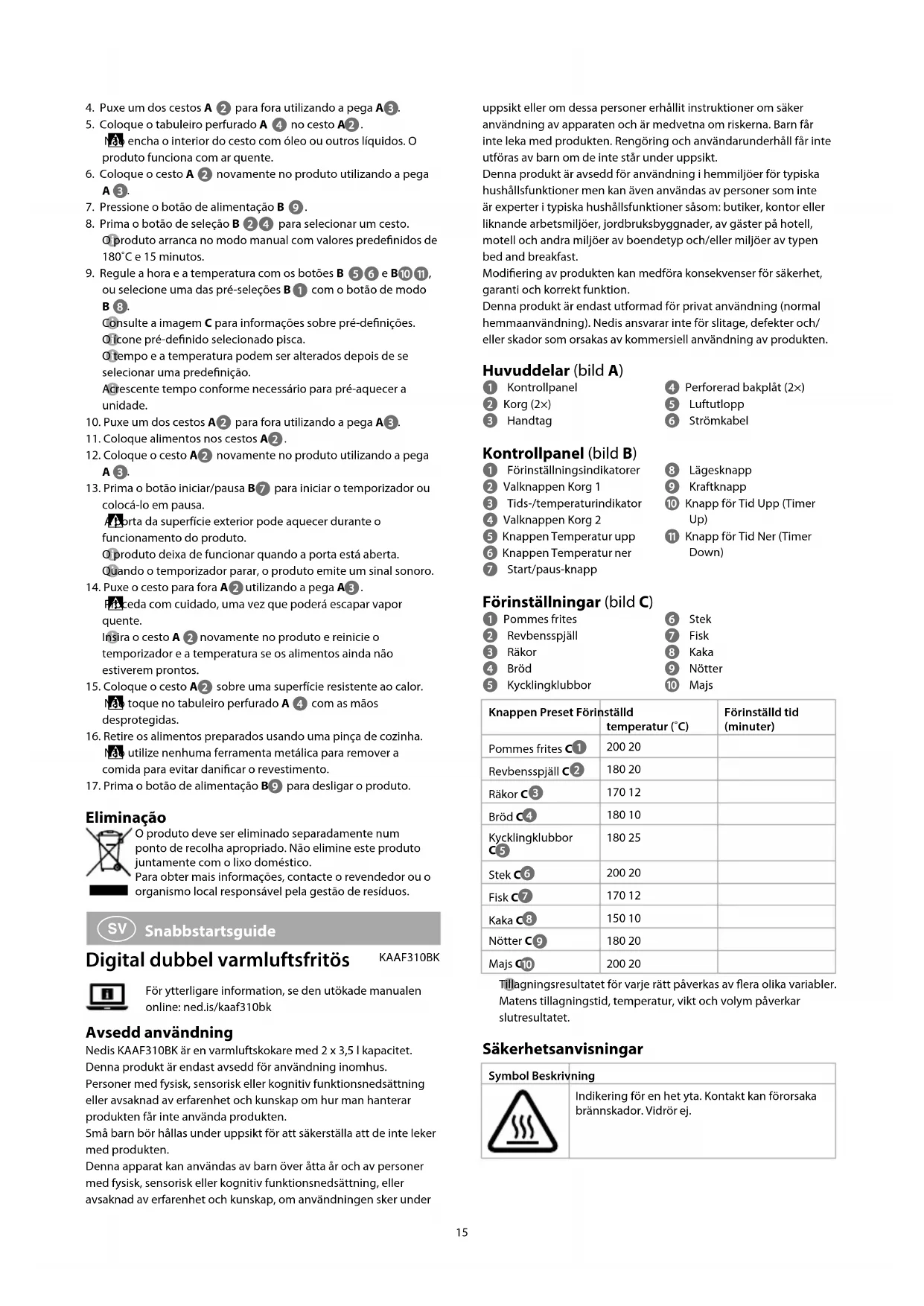 - Não deixe cair o produto e evite impactos.15 uppsikt eller om dessa personer erhållit instruktioner om säker användning av apparaten och är medvetna om riskerna. Barn får inte leka med produkten. Rengöring och användarunderhåll får inte utföras av barn om de inte står under uppsikt.Denna produkt är avsedd för användning i hemmiljöer för typiska hushållsfunktioner men kan även användas av personer som inte är experter i typiska hushållsfunktioner såsom: butiker, kontor eller liknande arbetsmiljöer, jordbruksbyggnader, av gäster på hotell, motell och andra miljöer av boendetyp och/eller miljöer av typen bed and breakfast.Modiering av produkten kan medföra konsekvenser för säkerhet, garanti och korrekt funktion.Denna produkt är endast utformad för privat användning (normal hemmaanvändning). Nedis ansvarar inte för slitage, defekter och/eller skador som orsakas av kommersiell användning av produkten. Huvuddelar (bild A) 1 Kontrollpanel2 Korg (2×)3 Handtag4 Perforerad bakplåt (2×)5 Luftutlopp6 Strömkabel Kontrollpanel (bild B) 1 Förinställningsindikatorer2 Valknappen Korg 13 Tids-/temperaturindikator4 Valknappen Korg 25 Knappen Temperatur upp6 Knappen Temperatur ner7 Start/paus-knapp8 Lägesknapp9 Kraftknappq Knapp för Tid Upp (Timer Up) w Knapp för Tid Ner (Timer Down) Förinställningar (bild C) 1 Pommes frites2 Revbensspjäll 3 Räkor 4 Bröd5 Kycklingklubbor 6 Stek 7 Fisk8 Kaka 9 Nötter q Majs Knappen Preset Förinställd temperatur (˚C)Förinställd tid (minuter)Pommes frites C 200 20Revbensspjäll C 180 20Räkor C 170 12Bröd C 180 10Kycklingklubbor