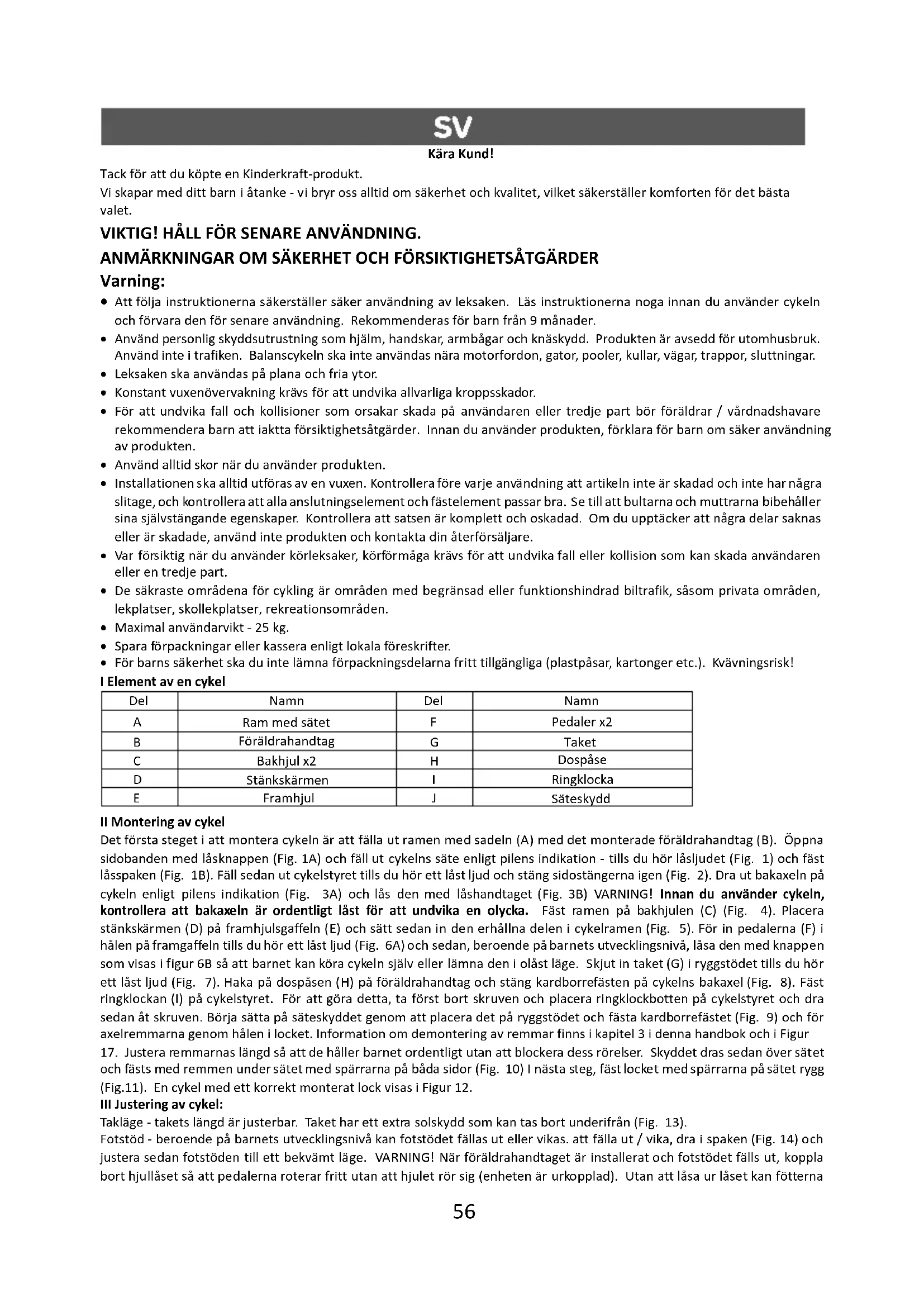 - För barns säkerhet ska du inte lämna förpackningsdelarna fritt tillgängliga (plastpåsar, kartonger etc.). Kvävningsrisk! I Element av en cykel Del Namn Del Namn