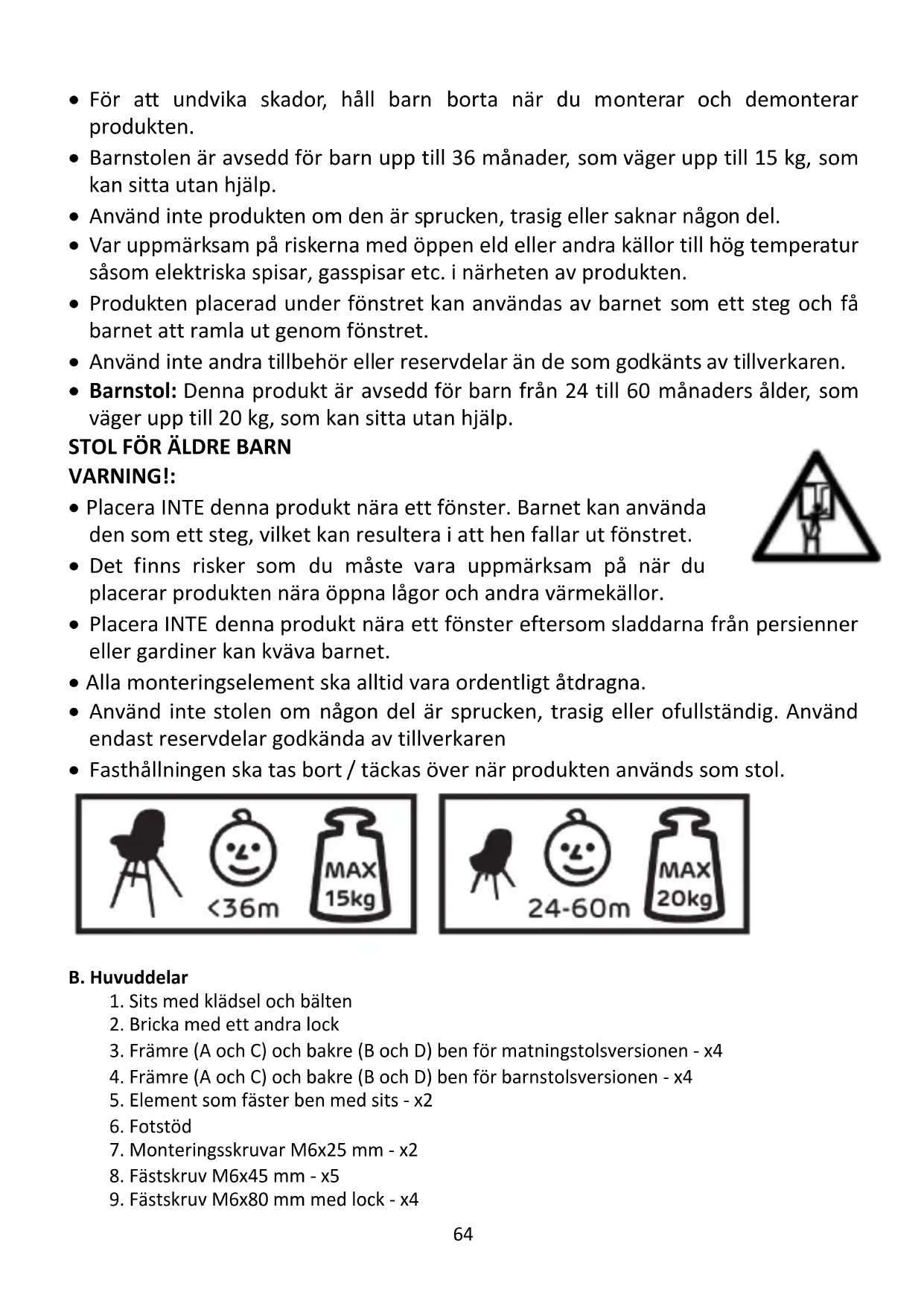 - Barnstol: Denna produkt är avsedd för barn från 24 till 60 månaders ålder, som väger upp till 20 kg, som kan sitta utan hjälp.