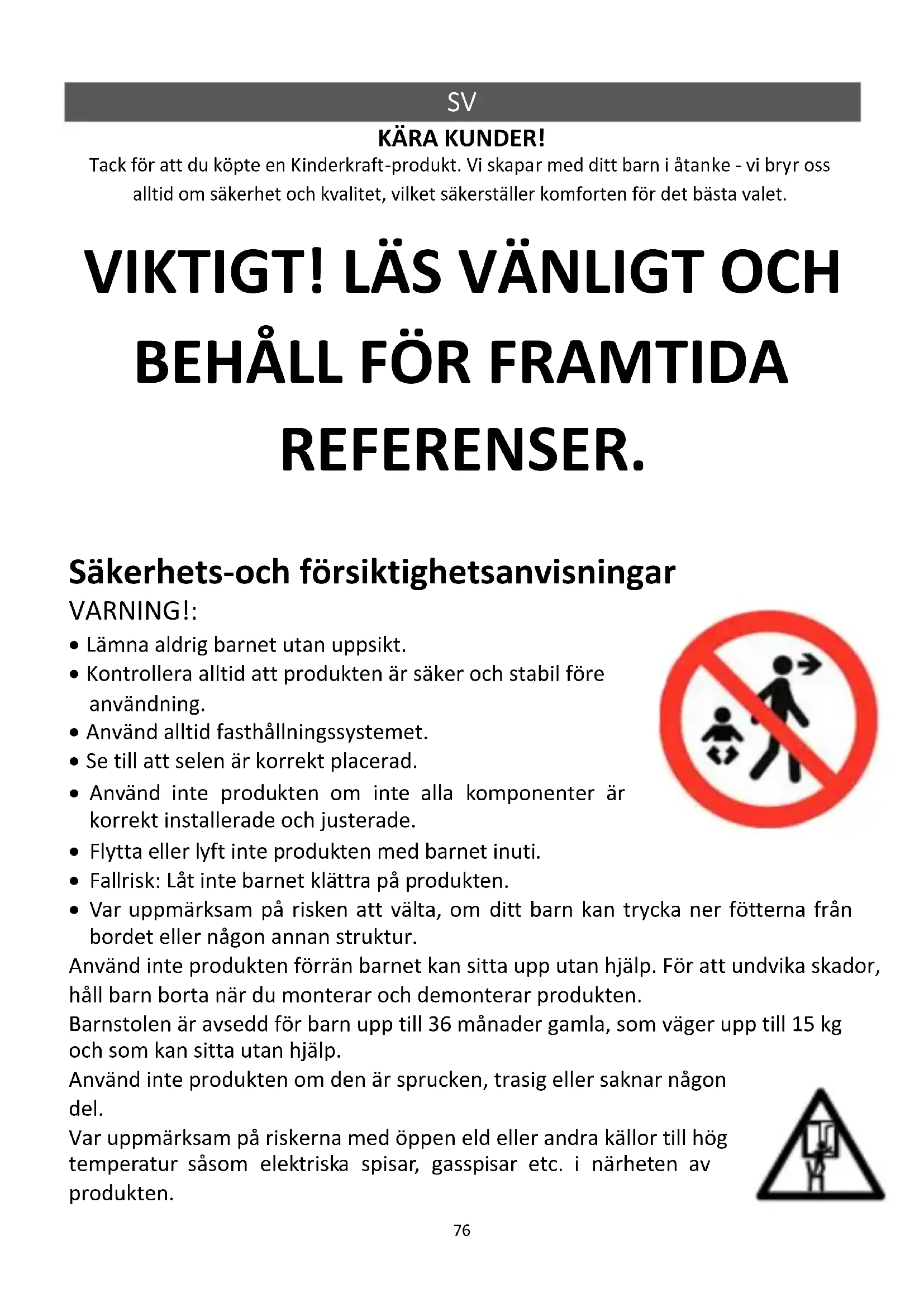 - Var uppmärksam på risken att välta, om ditt barn kan trycka ner fötterna från bordet eller någon annan struktur. Använd inte produkten förrän barnet kan sitta upp utan hjälp. För att undvika skador, håll barn borta när du monterar och demonterar produkten. Barnstolen är avsedd för barn upp till 36 månader gamla, som väger upp till 15 kg och som kan sitta utan hjälp. Använd inte produkten om den är sprucken, trasig eller saknar någon del. Var uppmärksam på riskerna med öppen eld eller andra källor till hög temperatur såsom elektriska spisar, gasspisar etc. i närheten av produkten.77 Placerad under ett fönster kan produkten användas av ett barn som ett steg och få barnet att ramla ut ur fönstret. Använd inte andra tillbehör eller reservdelar än de som godkänts av tillverkaren.
