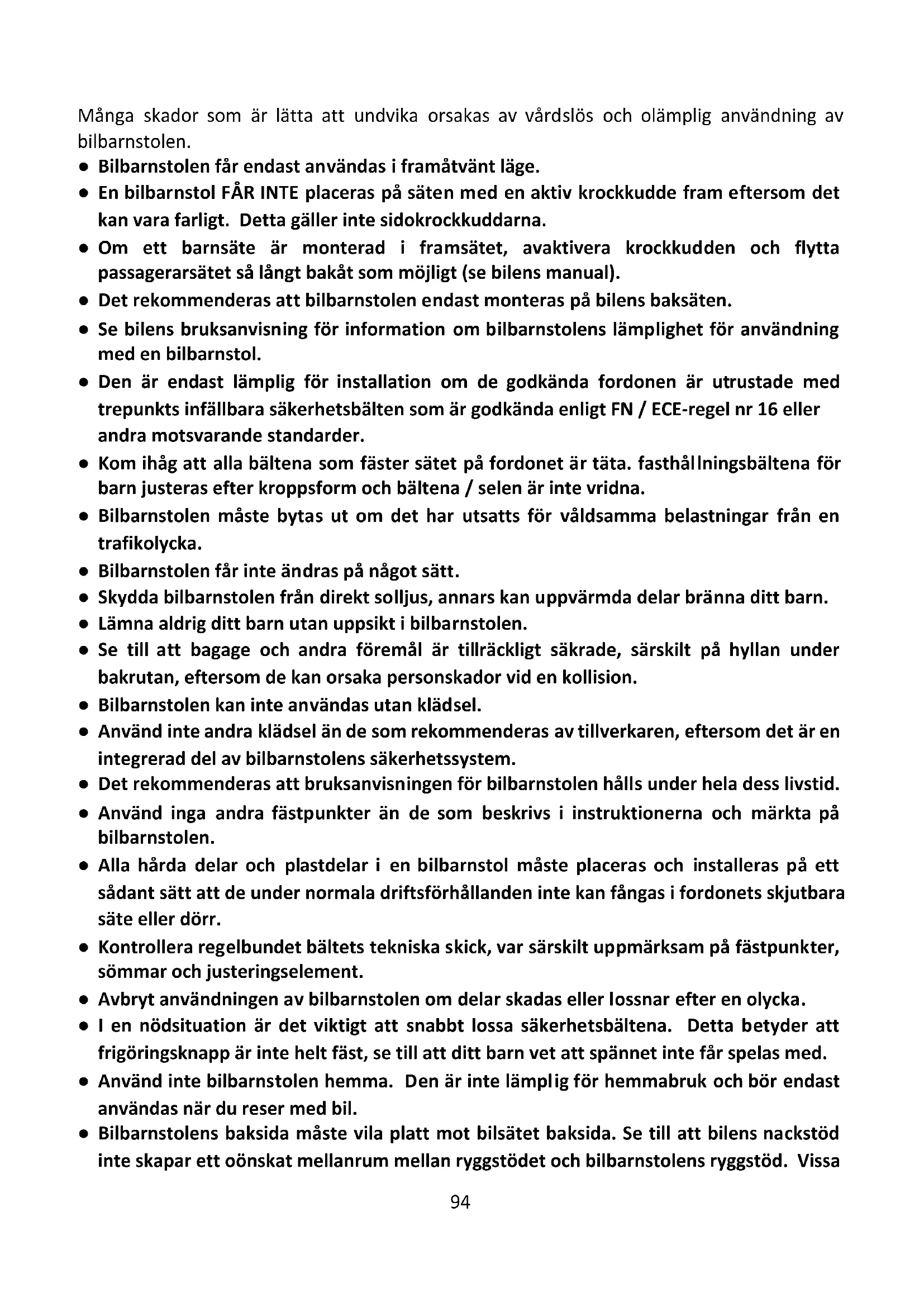 Ta några minuter att läsa dessa bruksanvisningar för att säkerställa ditt barns rätta säkerhet.94 Många skador som är lätta att undvika orsakas av vårdslös och olämplig användning av bilbarnstolen. ● Bilbarnstolen får endast användas i framåtvänt läge. ● En bilbarnstol FÅR INTE placeras på säten med en aktiv krockkudde fram eftersom det kan vara farligt. Detta gäller inte sidokrockkuddarna. ● Om ett barnsäte är monterad i framsätet, avaktivera krockkudden och flytta passagerarsätet så långt bakåt som möjligt (se bilens manual). ● Det rekommenderas att bilbarnstolen endast monteras på bilens baksäten. ● Se bilens bruksanvisning för information om bilbarnstolens lämplighet för användning med en bilbarnstol. ● Den är endast lämplig för installation om de godkända fordonen är utrustade med trepunkts infällbara säkerhetsbälten som är godkända enligt FN / ECE-regel nr 16 eller andra motsvarande standarder. ● Kom ihåg att alla bältena som fäster sätet på fordonet är täta. fasthållningsbältena för barn justeras efter kroppsform och bältena / selen är inte vridna. ● Bilbarnstolen måste bytas ut om det har utsatts för våldsamma belastningar från en trafikolycka. ● Bilbarnstolen får inte ändras på något sätt. ● Skydda bilbarnstolen från direkt solljus, annars kan uppvärmda delar bränna ditt barn. ● Lämna aldrig ditt barn utan uppsikt i bilbarnstolen. ● Se till att bagage och andra föremål är tillräckligt säkrade, särskilt på hyllan under bakrutan, eftersom de kan orsaka personskador vid en kollision. ● Bilbarnstolen kan inte användas utan klädsel. ● Använd inte andra klädsel än de som rekommenderas av tillverkaren, eftersom det är en integrerad del av bilbarnstolens säkerhetssystem. ● Det rekommenderas att bruksanvisningen för bilbarnstolen hålls under hela dess livstid. ● Använd inga andra fästpunkter än de som beskrivs i instruktionerna och märkta på bilbarnstolen. ● Alla hårda delar och plastdelar i en bilbarnstol måste placeras och installeras på ett sådant sätt att de under normala driftsförhållanden inte kan fångas i fordonets skjutbara säte eller dörr. ● Kontrollera regelbundet bältets tekniska skick, var särskilt uppmärksam på fästpunkter, sömmar och justeringselement. ● Avbryt användningen av bilbarnstolen om delar skadas eller lossnar efter en olycka. ● I en nödsituation är det viktigt att snabbt lossa säkerhetsbältena. Detta betyder att frigöringsknapp är inte helt fäst, se till att ditt barn vet att spännet inte får spelas med. ● Använd inte bilbarnstolen hemma. Den är inte lämplig för hemmabruk och bör endast användas när du reser med bil. ● Bilbarnstolens baksida måste vila platt mot bilsätet baksida. Se till att bilens nackstöd inte skapar ett oönskat mellanrum mellan ryggstödet och bilbarnstolens ryggstöd. Vissa95 bil nackstöd är ett hinder när du monterar en bilbarnstol och måste därför tas bort först. ● Säkerhetsbältesspännet för vuxna får inte placeras för nära undersidan av bilbarnstolens armstöd. Om du är osäker på denna punkt, kontakta tillverkaren av bilbarnstolen. ● Sätt ett bra exempel för ditt barn och spänn alltid fast. En vuxen som inte sitter fast med säkerhetsbälten kan också utgöra ett hot mot ett barn. ● Se till att bilbarnstolen sitter ordentligt före varje bilresa. ● Bilbarnstolen måste också fästas när det inte används. En fristående barnbilstol kan skada passagerarna även med nödbromsning.