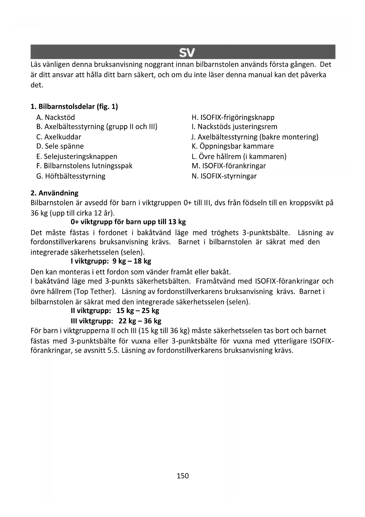 Bilbarnstolen är avsedd för barn i viktgruppen 0+ till III, dvs från födseln till en kroppsvikt på 36 kg (upp till cirka 12 år). 0+ viktgrupp för barn upp till 13 kg Det måste fästas i fordonet i bakåtvänd läge med tröghets 3-punktsbälte. Läsning av fordonstillverkarens bruksanvisning krävs. Barnet i bilbarnstolen är säkrat med den integrerade säkerhetsselen (selen). I viktgrupp: 9 kg – 18 kg Den kan monteras i ett fordon som vänder framåt eller bakåt. I bakåtvänd läge med 3-punkts säkerhetsbälten. Framåtvänd med ISOFIX-förankringar och övre hållrem (Top Tether). Läsning av fordonstillverkarens bruksanvisning krävs. Barnet i bilbarnstolen är säkrat med den integrerade säkerhetsselen (selen). II viktgrupp: 15 kg – 25 kg III viktgrupp: 22 kg – 36 kg För barn i viktgrupperna II och III (15 kg till 36 kg) måste säkerhetsselen tas bort och barnet fästas med 3-punktsbälte för vuxna eller 3-punktsbälte för vuxna med ytterligare ISOFIX- förankringar, se avsnitt 5.5. Läsning av fordonstillverkarens bruksanvisning krävs.151