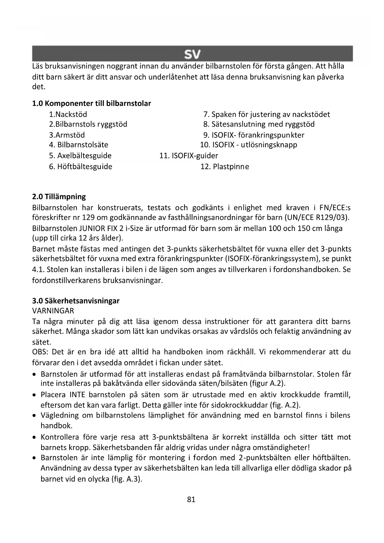 Bilbarnstolen har konstruerats, testats och godkänts i enlighet med kraven i FN/ECE:s föreskrifter nr 129 om godkännande av fasthållningsanordningar för barn (UN/ECE R129/03). Bilbarnstolen JUNIOR FIX 2 i-Size är utformad för barn som är mellan 100 och 150 cm långa (upp till cirka 12 års ålder). Barnet måste fästas med antingen det 3-punkts säkerhetsbältet för vuxna eller det 3-punkts säkerhetsbältet för vuxna med extra förankringspunkter (ISOFIX-förankringssystem), se punkt 4.1. Stolen kan installeras i bilen i de lägen som anges av tillverkaren i fordonshandboken. Se fordonstillverkarens bruksanvisningar.