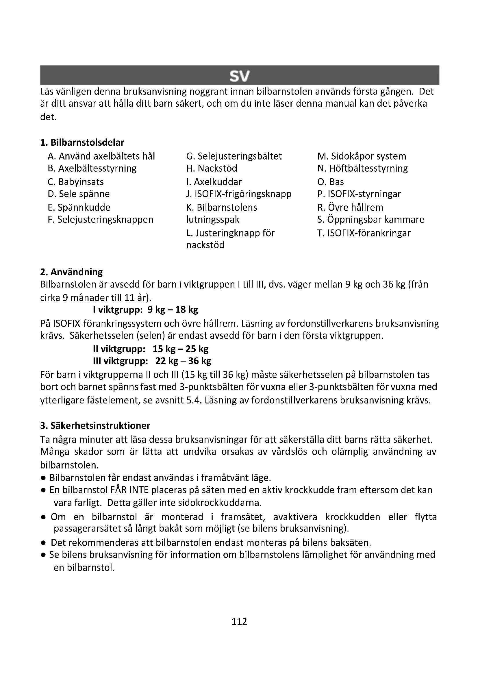 Ta några minuter att läsa dessa bruksanvisningar för att säkerställa ditt barns rätta säkerhet. Många skador som är lätta att undvika orsakas av vårdslös och olämplig användning av bilbarnstolen. ● Bilbarnstolen får endast användas i framåtvänt läge. ● En bilbarnstol FÅR INTE placeras på säten med en aktiv krockkudde fram eftersom det kan vara farligt. Detta gäller inte sidokrockkuddarna. ● Om en bilbarnstol är monterad i framsätet, avaktivera krockkudden eller flytta passagerarsätet så långt bakåt som möjligt (se bilens bruksanvisning). ● Det rekommenderas att bilbarnstolen endast monteras på bilens baksäten. ● Se bilens bruksanvisning för information om bilbarnstolens lämplighet för användning med en bilbarnstol.113 ● Den är endast lämplig för installation om de godkända fordonen är utrustade med trepunkts infällbara säkerhetsbälten som är godkända enligt FN / ECE-regel nr 16 eller andra motsvarande standarder. ● Kom ihåg att alla bältena som fäster bilbarnstolen på fordonet är täta selen som håller fast barnet är anpassad till kroppsformen och att bältena/ selen inte är vriden. ● Bilbarnstolen måste bytas ut om det har utsatts för våldsamma belastningar från en trafikolycka. ● Bilbarnstolen får inte ändras på något sätt. ● Skydda bilbarnstolen från direkt solljus, annars kan uppvärmda delar bränna ditt barn. ● Lämna aldrig ditt barn utan uppsikt i bilbarnstolen. ● Se till att bagage och andra föremål är tillräckligt säkrade, särskilt på hyllan under bakrutan, eftersom de kan orsaka personskador vid en kollision. ● Bilbarnstolen kan inte användas utan klädsel. ● Använd inte andra klädsel än de som rekommenderas av tillverkaren, eftersom det är en integrerad del av bilbarnstolens säkerhetssystem. ● Det rekommenderas att bruksanvisningen för bilbarnstolen hålls under hela dess livstid. ● Använd inga andra fästpunkter än de som beskrivs i instruktionerna och märkta på bilbarnstolen. ● Alla hårda delar och plastdelar i en bilbarnstol måste placeras och installeras på ett sådant sätt att de under normala driftsförhållanden inte kan fångas i fordonets skjutbara säte eller dörr. ● Kontrollera regelbundet selens tekniska skick, var särskilt uppmärksam på fästpunkterna, sömmarna och justeringselementen. ● Avbryt användningen av bilbarnstolen om delar skadas eller lossnar efter en olycka. ● I en nödsituation är det viktigt att snabbt lossa säkerhetsbältena. Detta betyder att frigöringsknapp är inte helt fäst, se till att ditt barn vet att spännet inte får spelas med. ● Använd inte bilbarnstolen hemma. Den är inte lämplig för hemmabruk och bör endast användas när du reser med bil. ● Bilbarnstolens baksida måste vila platt mot bilsätet baksida. Se till att bilens nackstöd inte skapar ett oönskat mellanrum mellan ryggstödet och bilbarnstolens ryggstöd. Vissa bil nackstöd är ett hinder när du monterar en bilbarnstol och måste därför tas bort först. ● Säkerhetsbältesspännet för vuxna får inte placeras för nära undersidan av bilbarnstolens armstöd. Om du är osäker på denna punkt, kontakta tillverkaren av bilbarnstolen. ● Sätt ett bra exempel för ditt barn och spänn alltid fast. En vuxen som inte sitter fast med säkerhetsbälten kan också utgöra ett hot mot ett barn. ● Se till att bilbarnstolen sitter ordentligt före varje bilresa. ● Bilbarnstolen måste också fästas när det inte används. En fristående barnbilstol kan skada passagerarna även med nödbromsning.114
