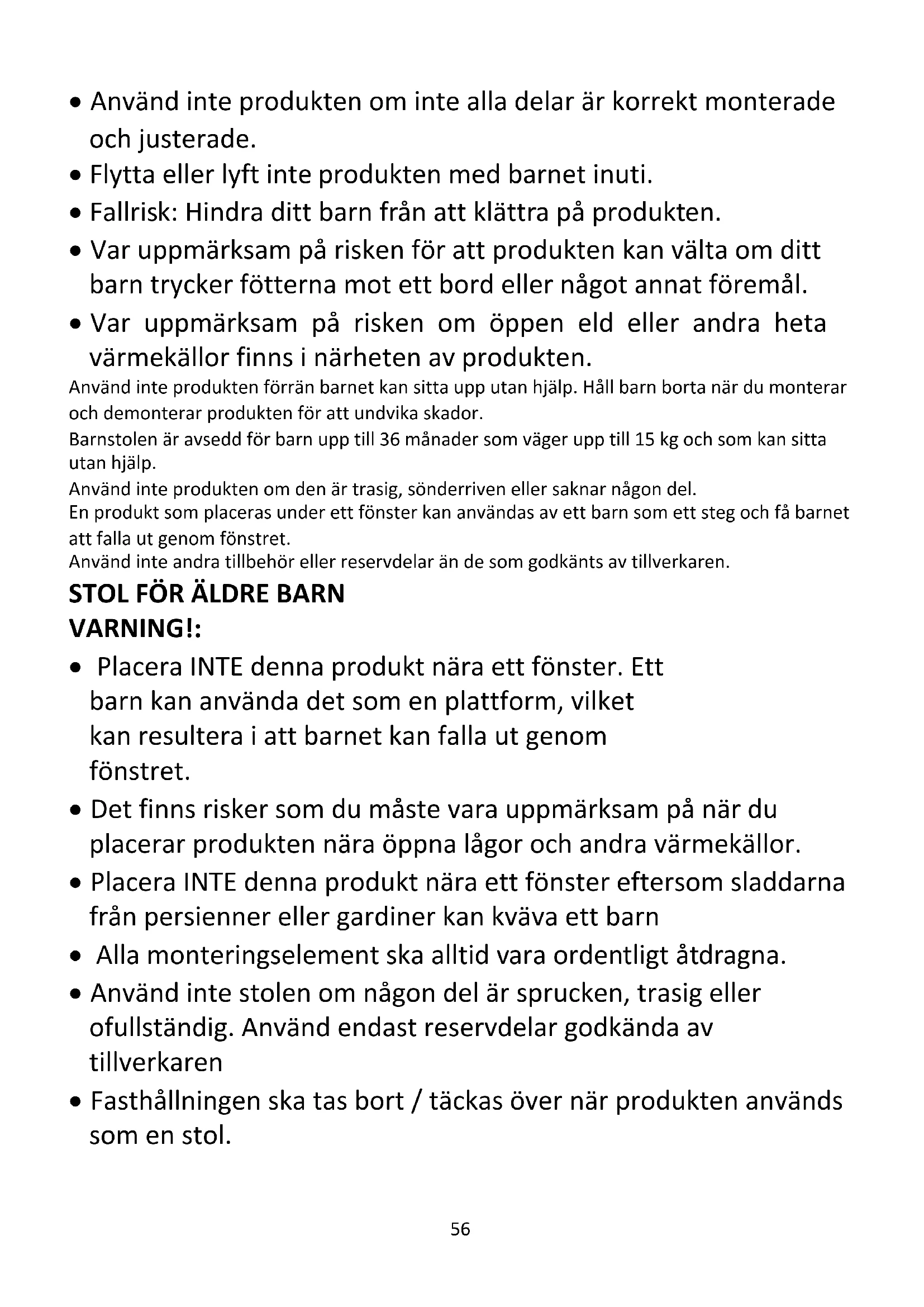 - Var uppmärksam på risken om öppen eld eller andra heta värmekällor finns i närheten av produkten. Använd inte produkten förrän barnet kan sitta upp utan hjälp. Håll barn borta när du monterar och demonterar produkten för att undvika skador. Barnstolen är avsedd för barn upp till 36 månader som väger upp till 15 kg och som kan sitta utan hjälp. Använd inte produkten om den är trasig, sönderriven eller saknar någon del. En produkt som placeras under ett fönster kan användas av ett barn som ett steg och få barnet att falla ut genom fönstret. Använd inte andra tillbehör eller reservdelar än de som godkänts av tillverkaren.