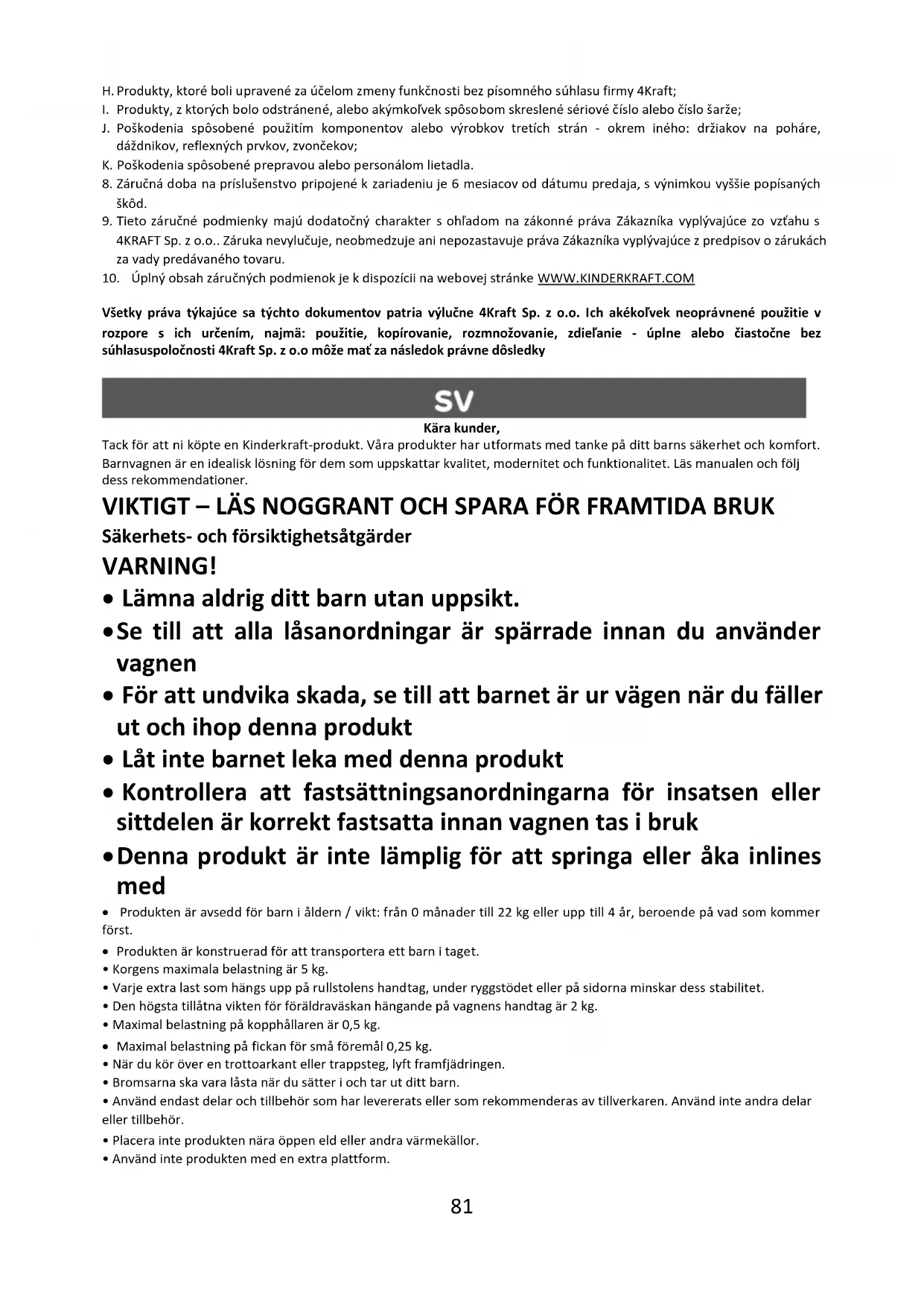 Všetky práva týkajúce sa týchto dokumentov patria výlučne 4Kraft Sp. z o.o. Ich akékoľvek neoprávnené použitie v rozpore s ich určením, najmä: použitie, kopírovanie, rozmnožovanie, zdieľanie - úplne alebo čiastočne bez súhlasuspoločnosti 4Kraft Sp. z o.o môže mať za následok právne dôsledky Kära kunder, Tack för att ni köpte en Kinderkraft-produkt. Våra produkter har utformats med tanke på ditt barns säkerhet och komfort. Barnvagnen är en idealisk lösning för dem som uppskattar kvalitet, modernitet och funktionalitet. Läs manualen och följ dess rekommendationer. VIKTIGT – LÄS NOGGRANT OCH SPARA FÖR FRAMTIDA BRUK Säkerhets- och försiktighetsåtgärder VARNING!