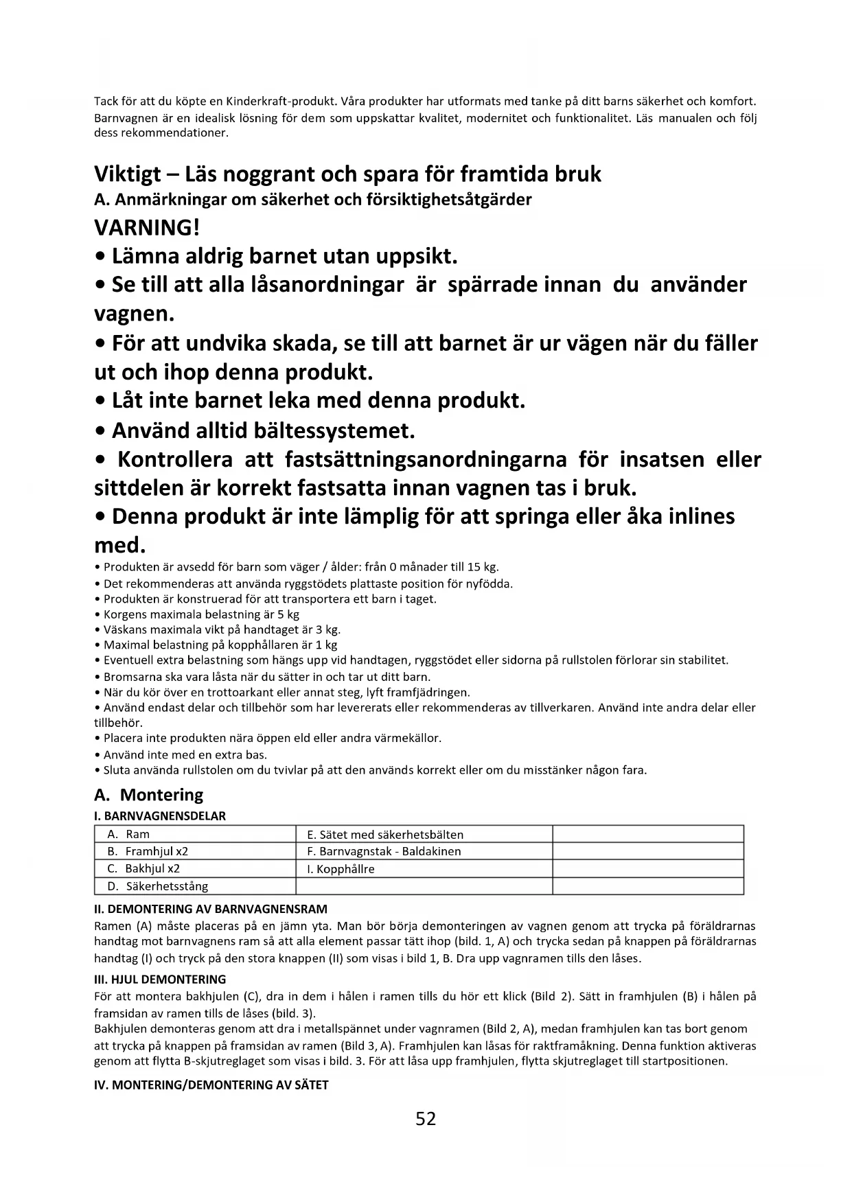 Kära kunder,52 Tack för att du köpte en Kinderkraft-produkt. Våra produkter har utformats med tanke på ditt barns säkerhet och komfort. Barnvagnen är en idealisk lösning för dem som uppskattar kvalitet, modernitet och funktionalitet. Läs manualen och följ dess rekommendationer. Viktigt – Läs noggrant och spara för framtida bruk A. Anmärkningar om säkerhet och försiktighetsåtgärder VARNING!