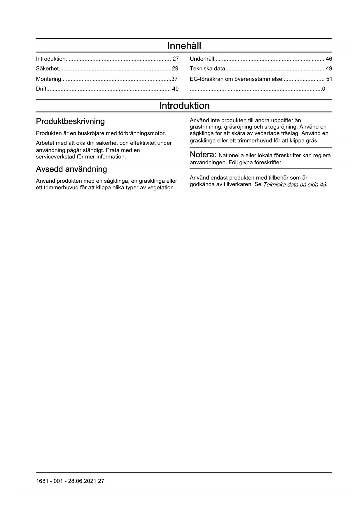 Introduktion Produktbeskrivning Produkten är en buskröjare med förbränningsmotor. Arbetet med att öka din säkerhet och effektivitet under användning pågår ständigt. Prata med en serviceverkstad för mer information. Avsedd användning Använd produkten med en sågklinga, en gräsklinga eller ett trimmerhuvud för att klippa olika typer av vegetation. Använd inte produkten till andra uppgifter än grästrimning, gräsröjning och skogsröjning. Använd en sågklinga för att skära av vedartade träslag. Använd en gräsklinga eller ett trimmerhuvud för att klippa gräs. Notera: Nationella eller lokala föreskrifter kan reglera användningen. Följ givna föreskrifter. Använd endast produkten med tillbehör som är godkända av tillverkaren. Se Tekniska data på sida 49