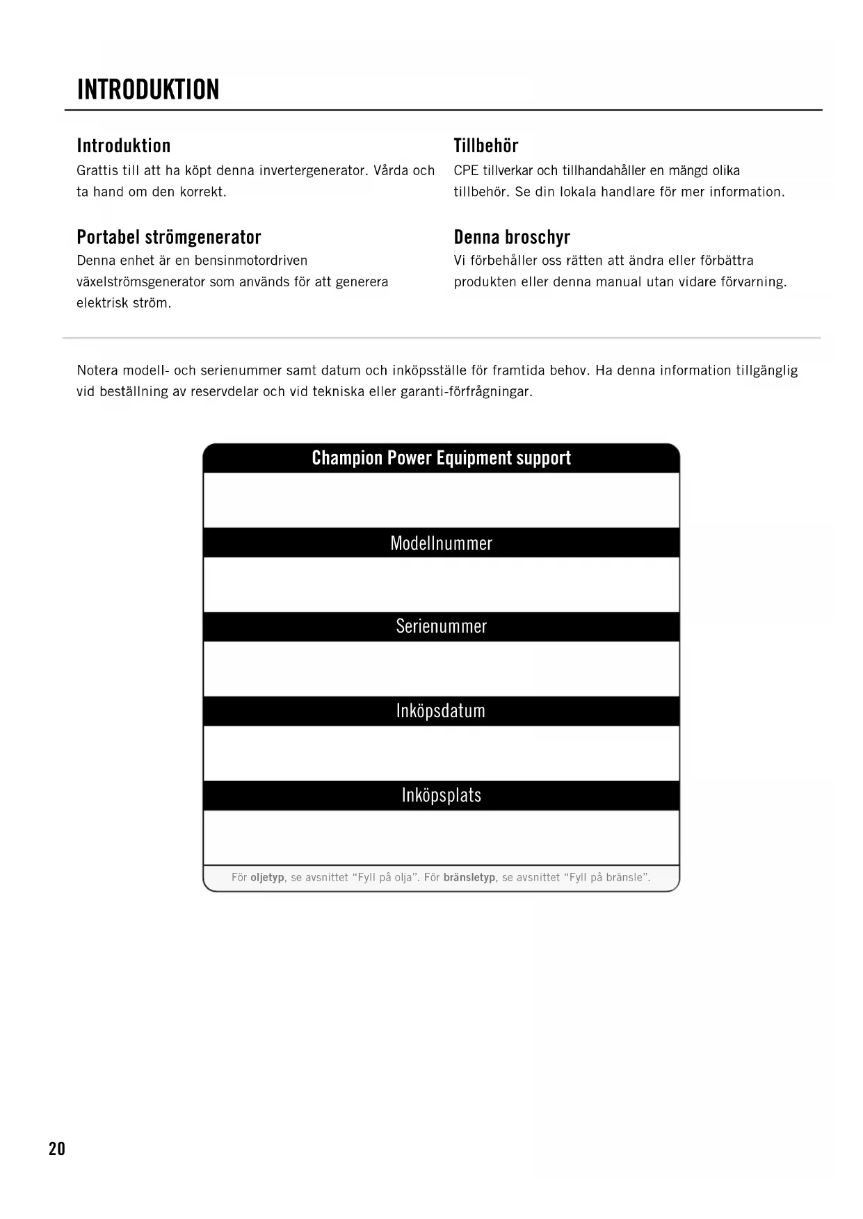 NOTE Changing a remote control battery may not require the user to reset the remote control. NOTE Parallel Operation Two (2) Champion model generators can be operated in parallel to increase the total available electrical power. A Champion parallel kit (optional equipment) is required for parallel operation. For kit availability, visit www.championpowerequipment.co.ukDetailed instructions for parallel kit installation, operation, and rating of the connected generators are provided in the parallel kit owner’s manual and operating instructions. EN20 Notera modell- och serienummer samt datum och inköpsställe för framtida behov. Ha denna information tillgänglig vid beställning av reservdelar och vid tekniska eller garanti-förfrågningar. Champion Power Equipment support Modellnummer Serienummer Inköpsdatum Inköpsplats För oljetyp, se avsnittet “Fyll på olja”. För bränsletyp, se avsnittet “Fyll på bränsle”. INTRODUKTION Introduktion Grattis till att ha köpt denna invertergenerator. Vårda och ta hand om den korrekt. Portabel strömgenerator Denna enhet är en bensinmotordriven växelströmsgenerator som används för att generera elektrisk ström. Tillbehör CPE tillverkar och tillhandahåller en mängd olika tillbehör. Se din lokala handlare för mer information. Denna broschyr Vi förbehåller oss rätten att ändra eller förbättra produkten eller denna manual utan vidare förvarning.21 Vänligen gör dig bekant med följande symboler. Säkerhetssymbolen och nyckelorden är säkerhetsvarningar. Följ alla säkerhetsmeddelanden för att undvika olyckor eller personskador. MANUALENS SyMBOLER FARA anger en potentiellt farlig situation som, om den inte undviks, kan leda till mindre eller måttliga personskador. FÖRSIKTIGHET VARNING utan symbolen för säkerhetsvarning anger en potentiellt farlig situation som, om den inte undviks, kan leda till skador på egendom. FÖRSIKTIGHET FARA anger en omedelbart farlig situation som, om den inte undviks, kommer att leda till död eller allvarlig personskada. FARA FARA anger en potentiellt farlig situation som, om den inte undviks, kan leda till död eller allvarlig personskada. VARNING Om du har frågor om din generator kan vi hjälpa dig. Vänligen kontakta din lokala handlare. OBSERVERA SV22 SÄKERHETSREGLER Generatoravgaser innehåller kolmonoxid som är en färglös, doftfri, giftig gas. Att andas in kolmonoxid kommer att orsaka illamående, yrsel, svimning eller död. Om du börjar känna dig yr eller svag, se till att få frisk luft omedelbart. Använd generatorn utomhus och på en väl ventilerad plats. ANVÄND INTE generatorn inomhus. Detta inkluderar garage, källare, kryputrymmen, förråd, inhägnader eller avdelningar samt generatorutrymmen i husbilar eller husvagnar. LÅT INTE avgasångor tränga in i stängda utrymmen genom fönster, dörrar, ventiler eller andra öppningar. KOLMONOXIDVARNING: att använda en generator inomhus KAN DÖDA DIG PÅ ETT PAR MINUTER. FARA Roterande delar kan trassla in händer, fötter, hår, kläder och/eller accessoarer. Traumatiska amputationer eller allvarliga skärsår kan uppstå. Se till att hålla händer och fötter borta från roterande delar. Sätt upp långt hår och ta bort smycken. Använd utrustning med skydd på plats. ANVÄND INTE löst sittande kläder, hängande snören eller andra saker som kan fastna eller ryckas in. FARA Generatorn producerar kraftfull spänning. RÖR INTE nakna sladdar eller kärl. ANVÄND INTE elektriska sladdar som är slitna, skadade eller trasiga. ANVÄND INTE generatorn i vått väder. TILLÅT INTE barn eller okvalificerade personer att hantera eller genomföra underhåll på generatorn. Använd en säkerhetsbrytare på fuktiga ställen eller på ställen med strömförande material såsom metallunderlag. Använd godkänd överföringsutrustning för att isolera generatorn från dina elektriska verktyg och meddela ditt elbolag innan du ansluter din generator till elnätet. FARA Gnistor kan resultera i brand eller elektriska stötar. Vid underhåll av generatorn: Koppla ifrån sladden till tändstiftet och placera den så att den inte kan komma i kontakt med tändstiftet. Undersök INTE om det bildas gnistor när tändstiftet är borttaget. Använd endast godkända testare av tändstift. VARNING Att köra motorer som producerar hetta. Allvarliga skador kan uppstå vid kontakt. Brännbart material kan fatta eld vid kontakt. RÖR INTE heta ytor. Undvik kontakt med heta avgaser. Låt utrustning svalna av innan den vidrörs. Se till att hålla ett avstånd på minst 1 meter (ca 3 ft.) på alla sidor för att säkerställa tillräcklig avkylning. Se till att hålla ett avstånd på minst 1,5 meter (ca 5 ft.) från brännbart material. VARNING Medicinsk och livsuppehållande användning. Kontakta larmassistans omedelbart i händelse av en olycka. ANVÄND ALDRIG den här produkten för att driva livsuppehållande enheter eller apparater. ANVÄND ALDRIG den här produkten för att driva medicinska enheter eller apparater. Informera din elleverantör omedelbart om någon iditt hushåll är beroende av elektrisk utrustning föratt överleva. Informera din elleverantör omedelbart om någon iditt hushåll skulle uppleva en medicinsk kris utan tillgänglig elektricitet. VARNING Avgaserna från den här produkten innehåller kemikalier som är dokumenterat skadliga för hälsan eller t.o.m. dödliga. VARNING Läs denna manual noggrant innan du använder din generator. Att avvika från instruktionerna kan leda till allvarliga skador eller död. VARNING Denna produkt innehåller ett knappbatteri. Om det sväljs kan det orsaka allvarlig skada eller död inom endast två timmar. Uppsök läkare omedelbart. VARNING23 SÄKERHETSREGLER Olämplig hantering eller användning av din generator kan skadad den, förkorta dess livslängd och göra garantin ogiltig.Använd endast generatorn på avsett sätt.Använd endast på jämn, platt mark.UTSÄTT INTE generatorn f