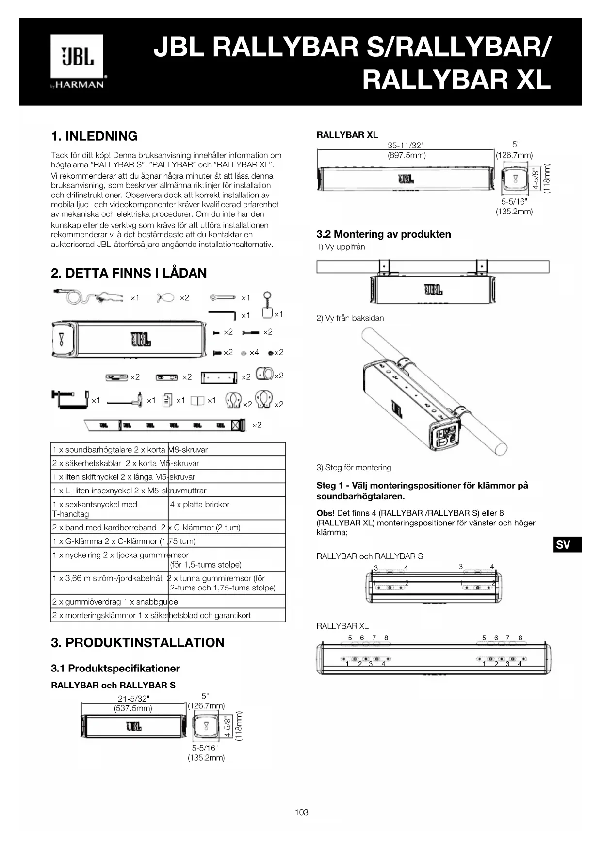 Tack för ditt köp! Denna bruksanvisning innehåller information om högtalarna ”RALLYBAR S”, ”RALLYBAR” och ”RALLYBAR XL”. Vi rekommenderar att du ägnar några minuter åt att läsa denna bruksanvisning, som beskriver allmänna riktlinjer för installation och drifinstruktioner. Observera dock att korrekt installation av mobila ljud- och videokomponenter kräver kvalificerad erfarenhet av mekaniska och elektriska procedurer. Om du inte har den kunskap eller de verktyg som krävs för att utföra installationen rekommenderar vi å det bestämdaste att du kontaktar en auktoriserad JBL-återförsäljare angående installationsalternativ.
