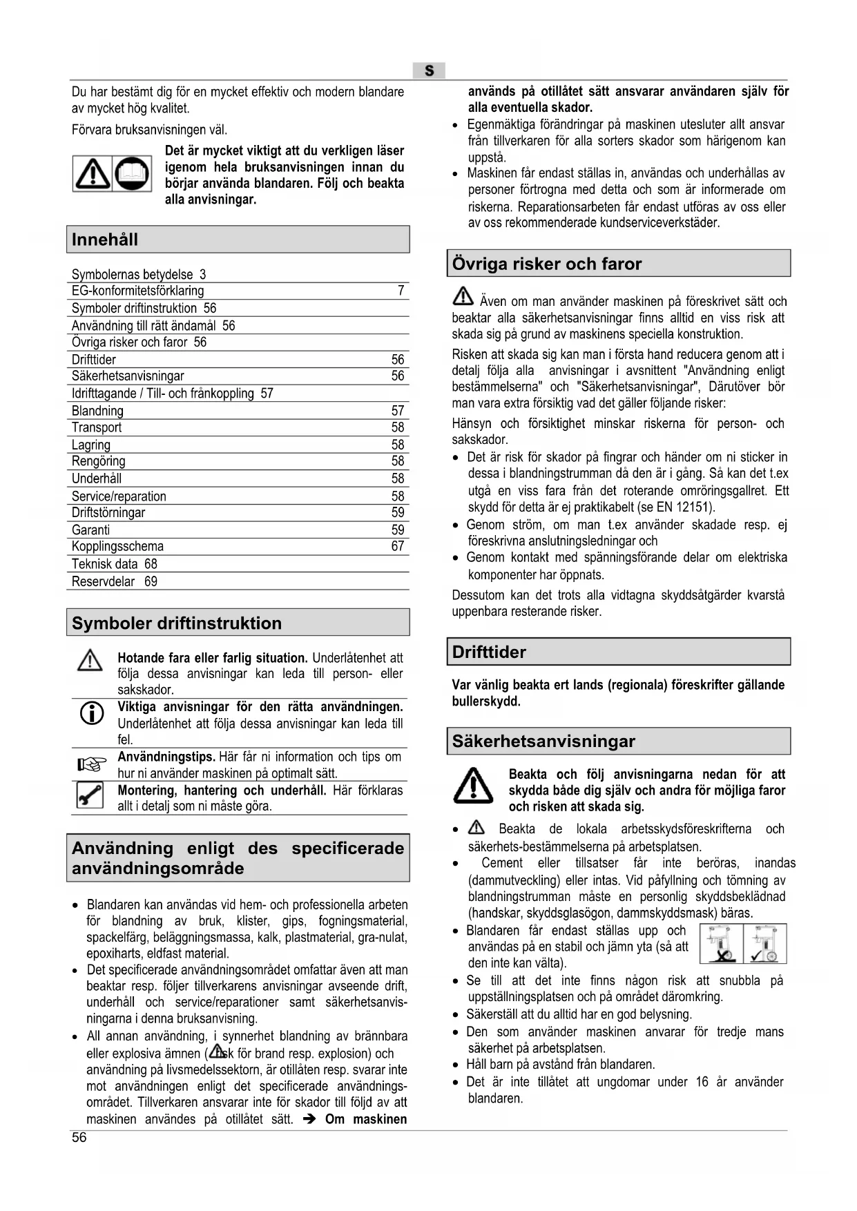 Användningstips. Här får ni information och tips om hur ni använder maskinen på optimalt sätt. Montering, hantering och underhåll. Här förklaras allt i detalj som ni måste göra. Användning enligt des specificerade användningsområde Blandaren kan användas vid hem- och professionella arbeten för blandning av bruk, klister, gips, fogningsmaterial, spackelfärg, beläggningsmassa, kalk, plastmaterial, gra-nulat, epoxiharts, eldfast material. Det specificerade användningsområdet omfattar även att man beaktar resp. följer tillverkarens anvisningar avseende drift, underhåll och service/reparationer samt säkerhetsanvis- ningarna i denna bruksanvisning. All annan användning, i synnerhet blandning av brännbara eller explosiva ämnen ( risk för brand resp. explosion) och användning på livsmedelssektorn, är otillåten resp. svarar inte mot användningen enligt det specificerade användnings- området. Tillverkaren ansvarar inte för skador till följd av att maskinen användes på otillåtet sätt. Om maskinen används på otillåtet sätt ansvarar användaren själv för alla eventuella skador. Egenmäktiga förändringar på maskinen utesluter allt ansvar från tillverkaren för alla sorters skador som härigenom kan uppstå. Maskinen får endast ställas in, användas och underhållas av personer förtrogna med detta och som är informerade om riskerna. Reparationsarbeten får endast utföras av oss eller av oss rekommenderade kundserviceverkstäder. Övriga risker och faror Även om man använder maskinen på föreskrivet sätt och beaktar alla säkerhetsanvisningar finns alltid en viss risk att skada sig på grund av maskinens speciella konstruktion. Risken att skada sig kan man i första hand reducera genom att i detalj följa alla anvisningar i avsnittent "Användning enligt bestämmelserna" och "Säkerhetsanvisningar", Därutöver bör man vara extra försiktig vad det gäller följande risker: Hänsyn och försiktighet minskar riskerna för person- och sakskador. Det är risk för skador på fingrar och händer om ni sticker in dessa i blandningstrumman då den är i gång. Så kan det t.ex utgå en viss fara från det roterande omröringsgallret. Ett skydd för detta är ej praktikabelt (se EN 12151). Genom ström, om man t.ex använder skadade resp. ej föreskrivna anslutningsledningar och Genom kontakt med spänningsförande delar om elektriska komponenter har öppnats. Dessutom kan det trots alla vidtagna skyddsåtgärder kvarstå uppenbara resterande risker. Drifttider Var vänlig beakta ert lands (regionala) föreskrifter gällande bullerskydd. Säkerhetsanvisningar
