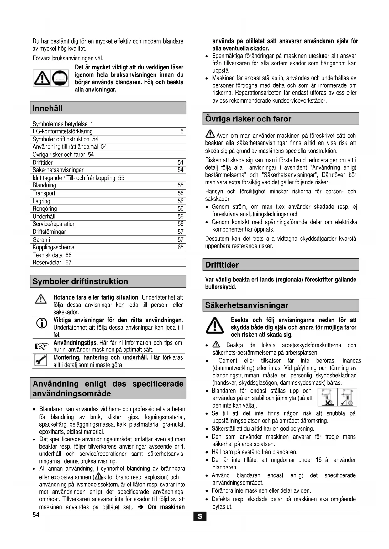 Просим обратить внимание на прилагаемое гарантийное обязательство.54 Du har bestämt dig för en mycket effektiv och modern blandare av mycket hög kvalitet. Förvara bruksanvisningen väl. Det är mycket viktigt att du verkligen läser igenom hela bruksanvisningen innan du börjar använda blandaren. Följ och beakta alla anvisningar. Innehåll Symbolernas betydelse 1 EG-konformitetsförklaring 5 Symboler driftinstruktion 54 Användning till rätt ändamål 54 Övriga risker och faror 54 Drifttider 54 Säkerhetsanvisningar 54 Idrifttagande / Till- och frånkoppling 55 Blandning 55 Transport 56 Lagring 56 Rengöring 56 Underhåll 56 Service/reparation 56 Driftstörningar 57 Garanti 57 Kopplingsschema 65 Teknisk data 66 Reservdelar 67 Symboler driftinstruktion